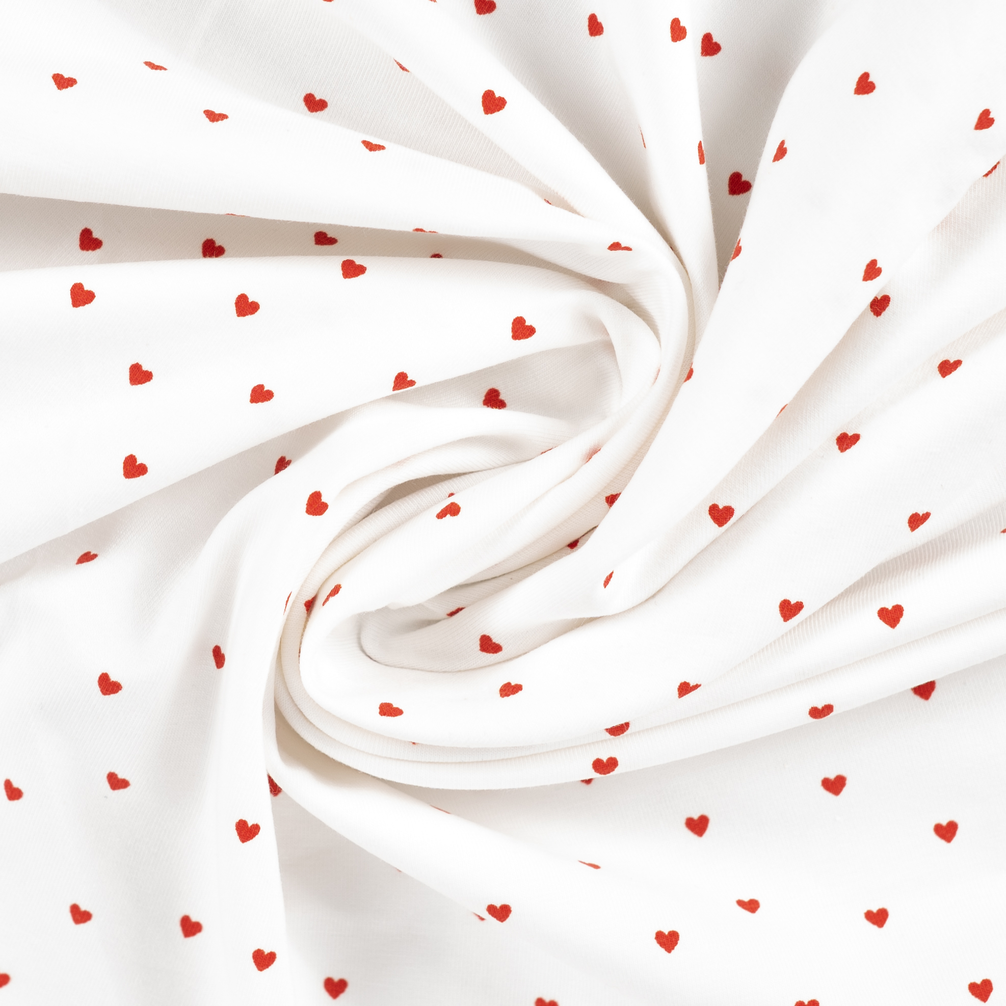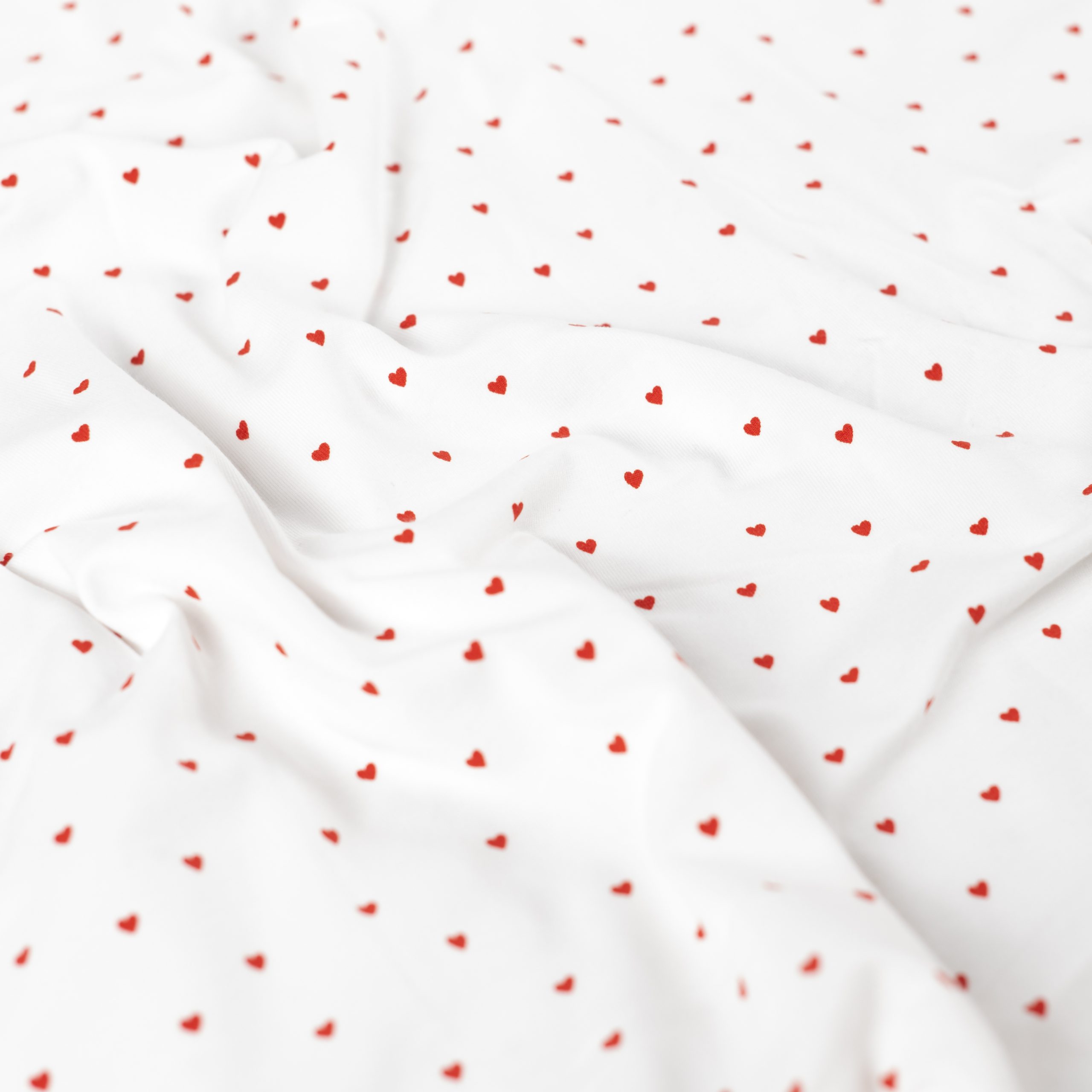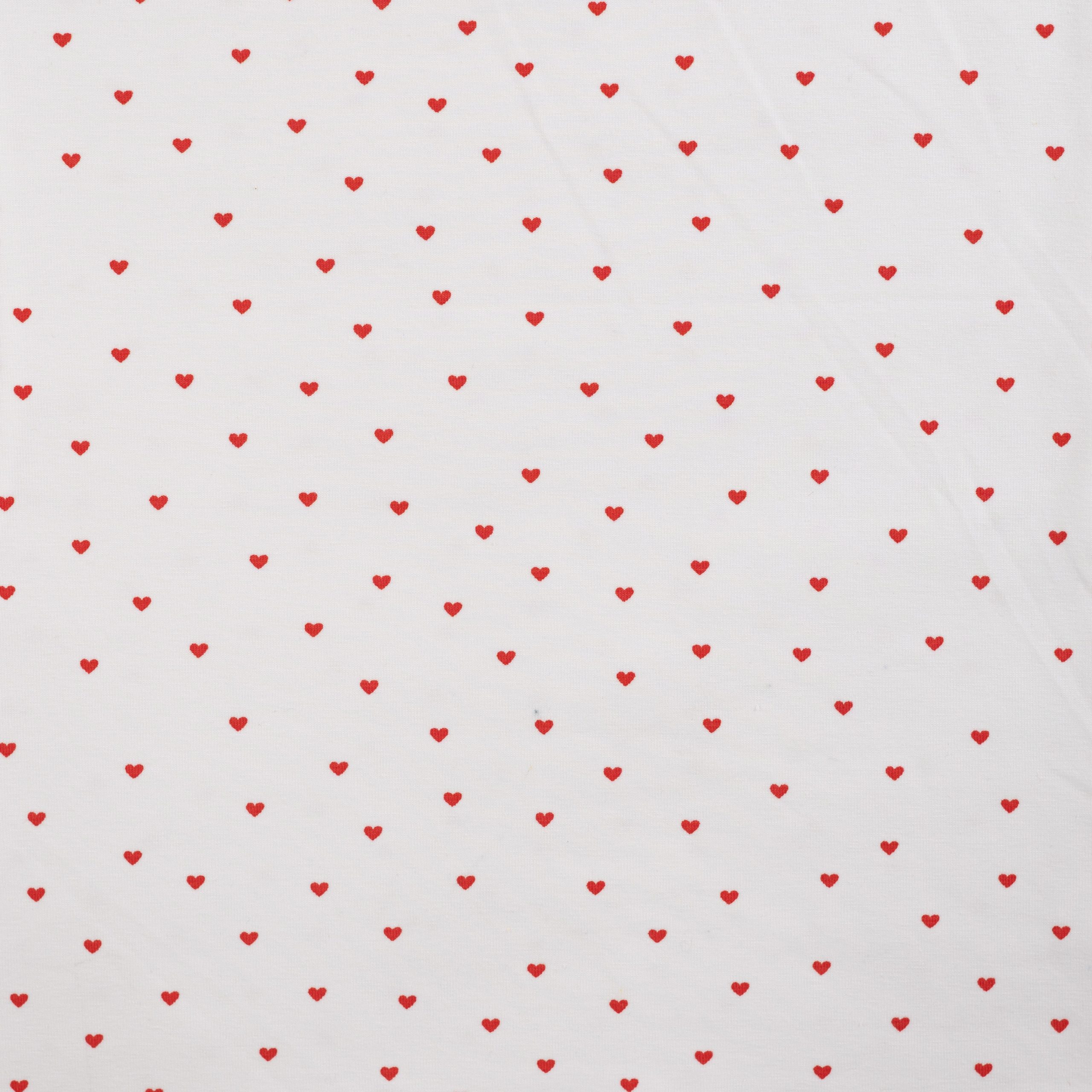 Deze jersey in ecru met rode hartjes heeft een lieve en speelse uitstraling. De zachte ecru basis gecombineerd met kleine rode hartjes zorgt voor een vrolijk en tijdloos dessin dat perfect past bij zowel kinder- als dameskleding.