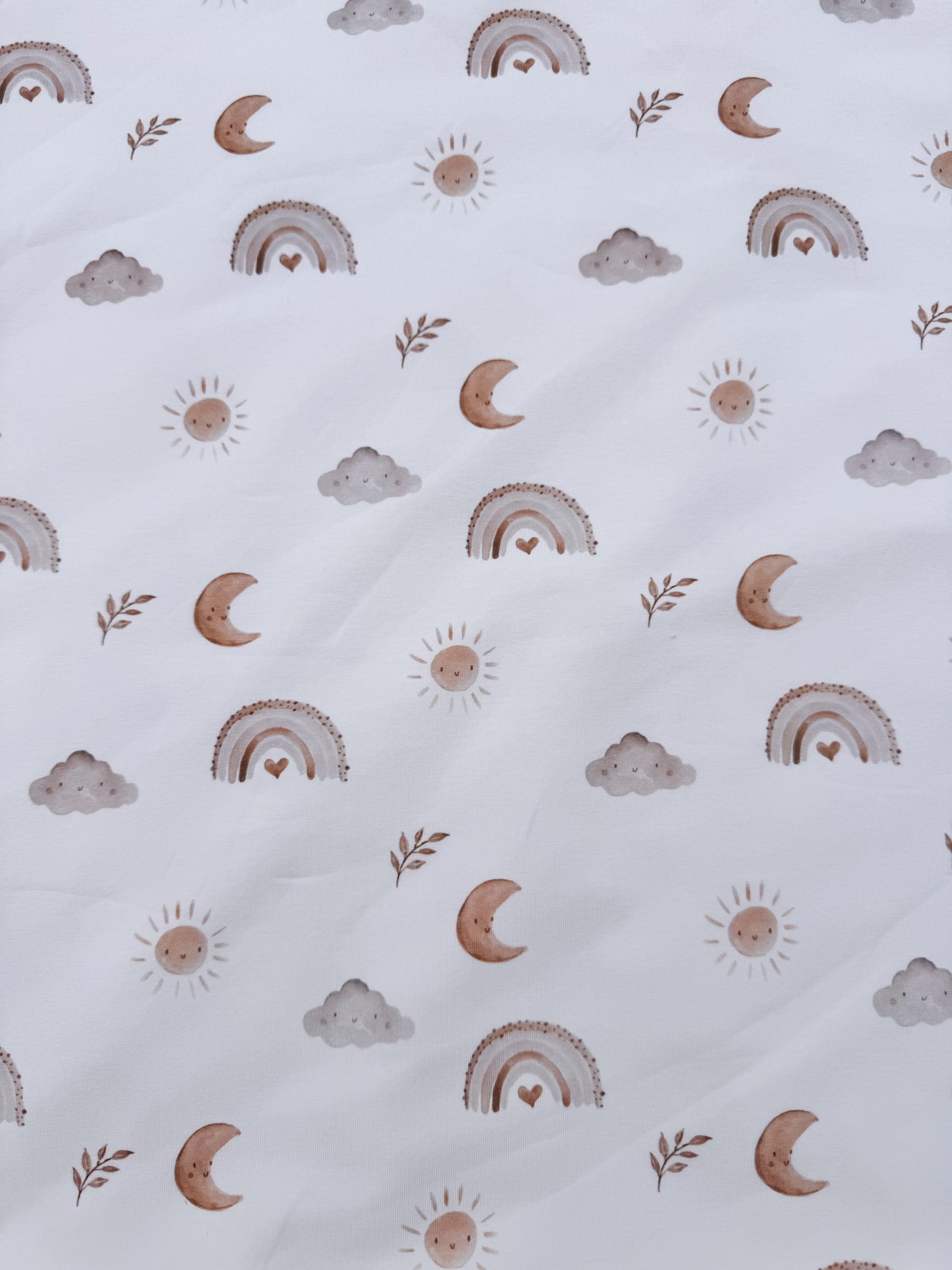 Dompel je onder in een hemelse sfeer met onze Lunar Dreams jersey, bedrukt met een betoverend motief van maan en sterren. Het zachte, rekbare jersey voelt heerlijk comfortabel aan en is ideaal voor kleding zoals tops, jurken, pyjama’s of babykleding. Het nachtelijke ontwerp geeft een dromerige en stijlvolle uitstraling, perfect voor iedereen die houdt van een vleugje magie in dagelijkse outfits.