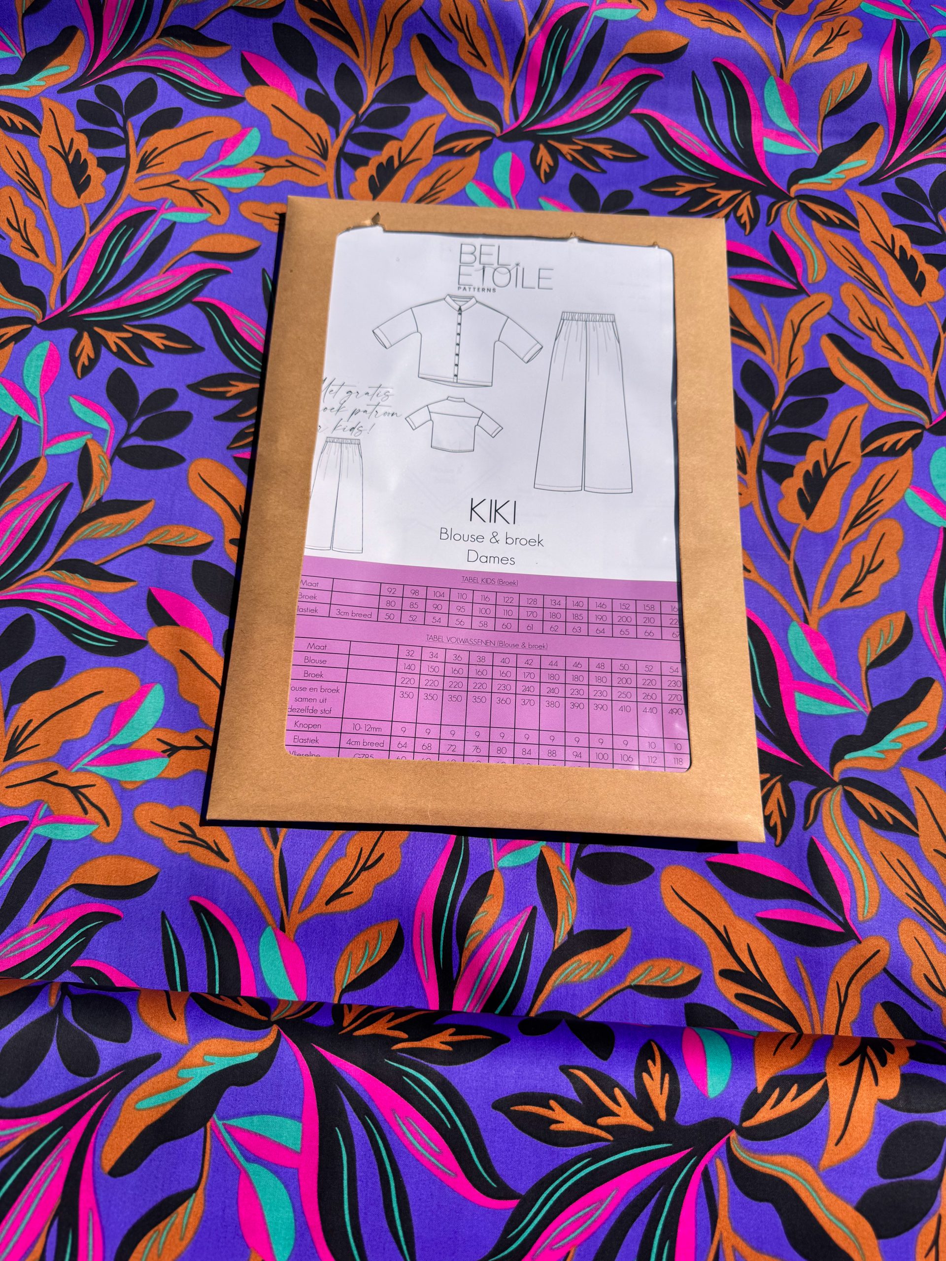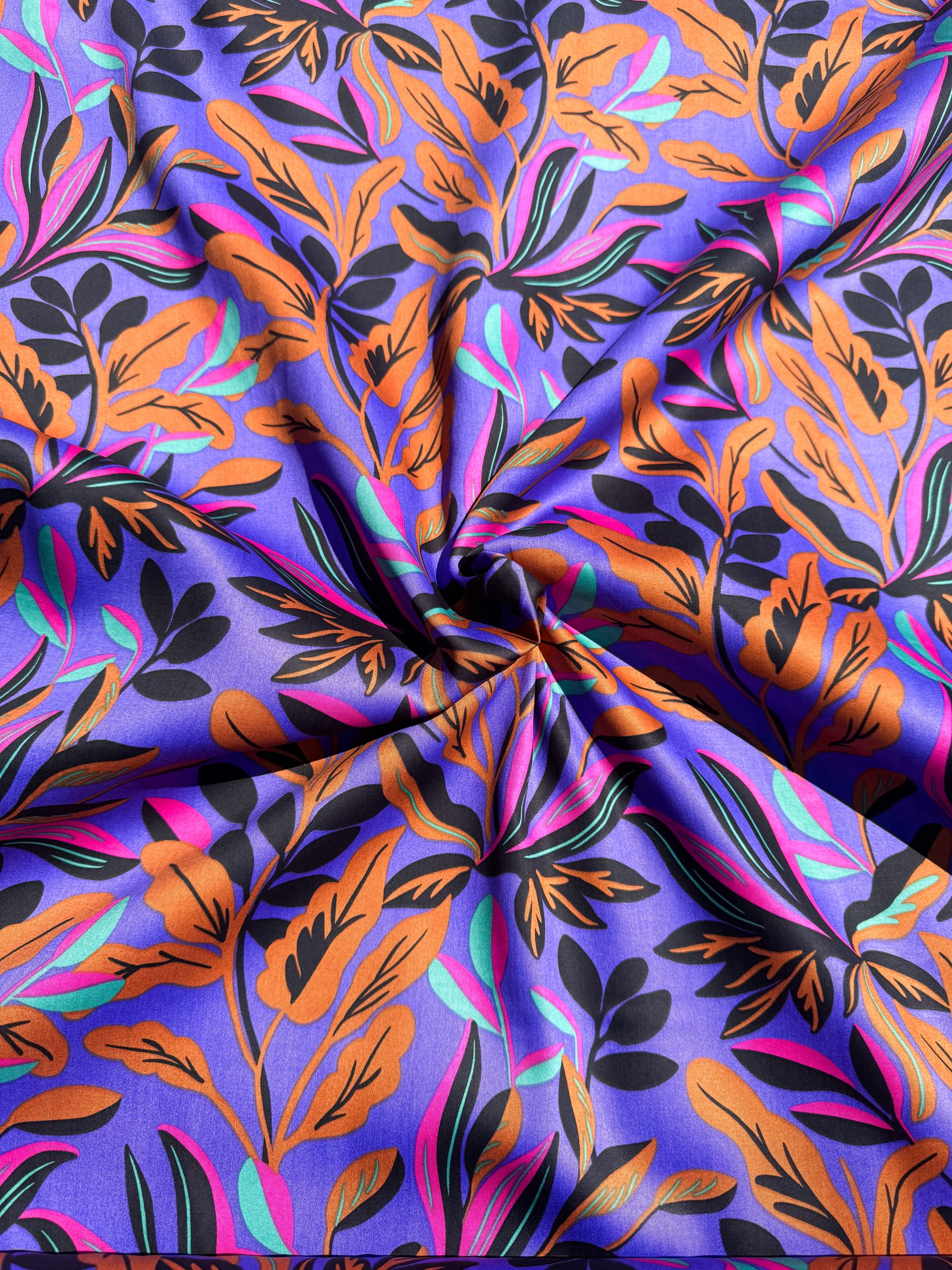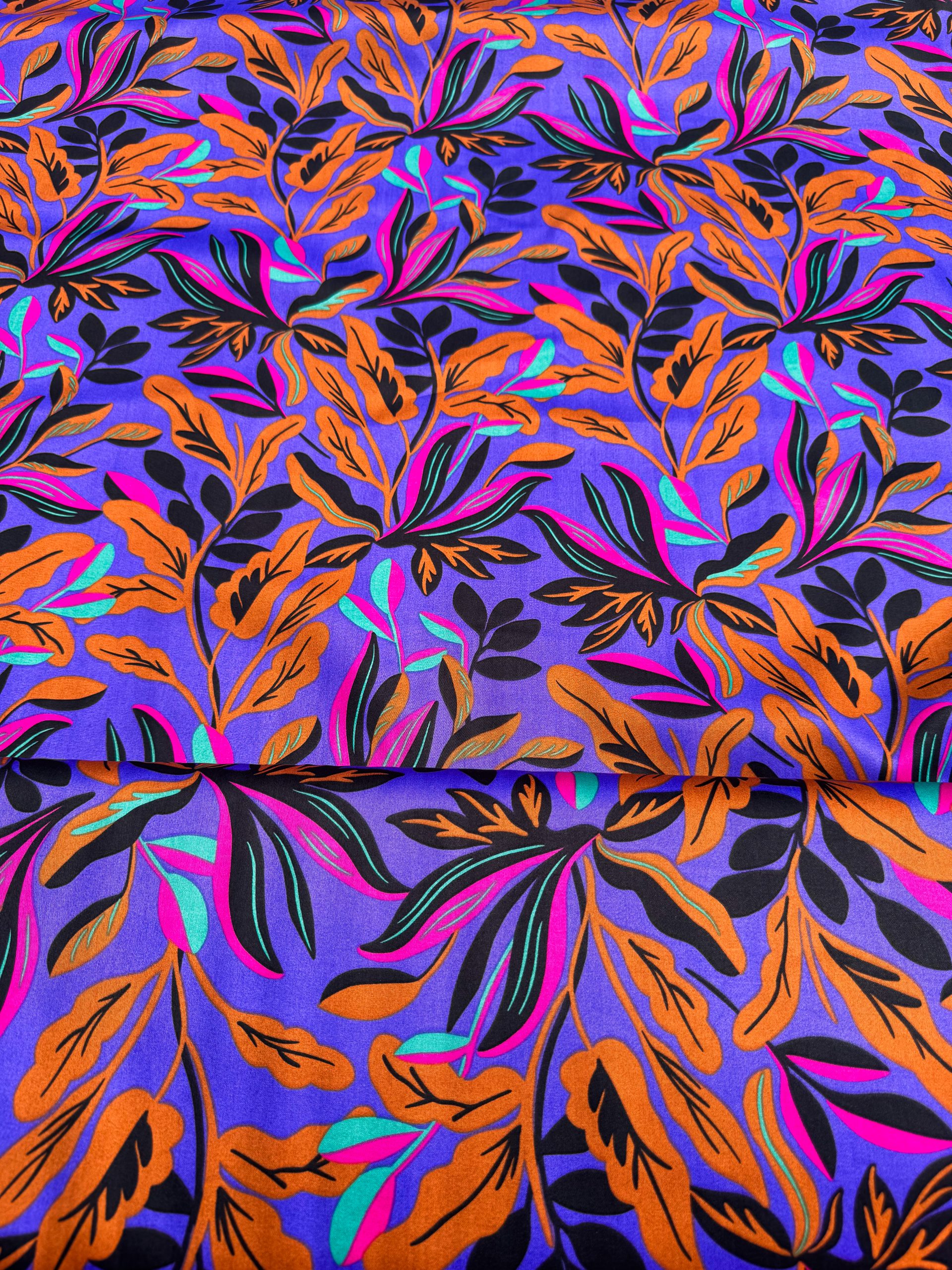 Breng kleur en luxe in je creaties met deze prachtige katoen satijnen stof van Nerida Hansen. Deze exclusieve designerstof combineert opvallende kleuren en organische vormen tot een levendig botanisch patroon dat direct in het oog springt. Met een diepe paarse achtergrond en accenten in feloranje, fuchsia, turquoise en zwart, is dit een echte blikvanger.