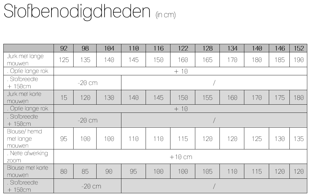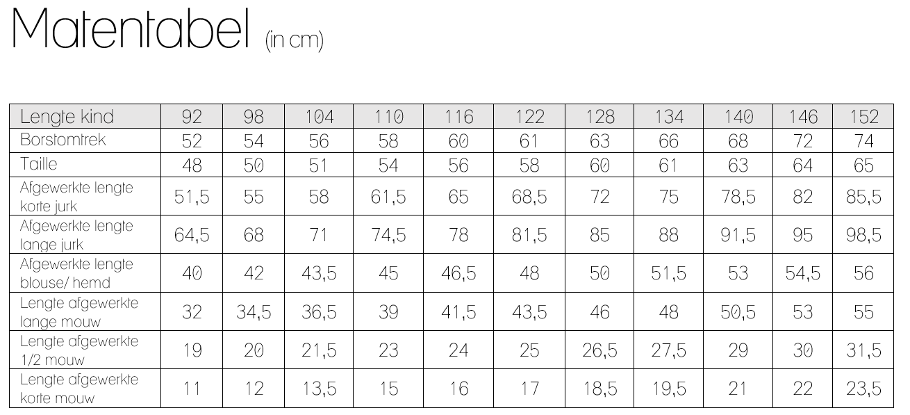 – Patroondelen in de maten 92 (BO 52) – 152 (BO 74)