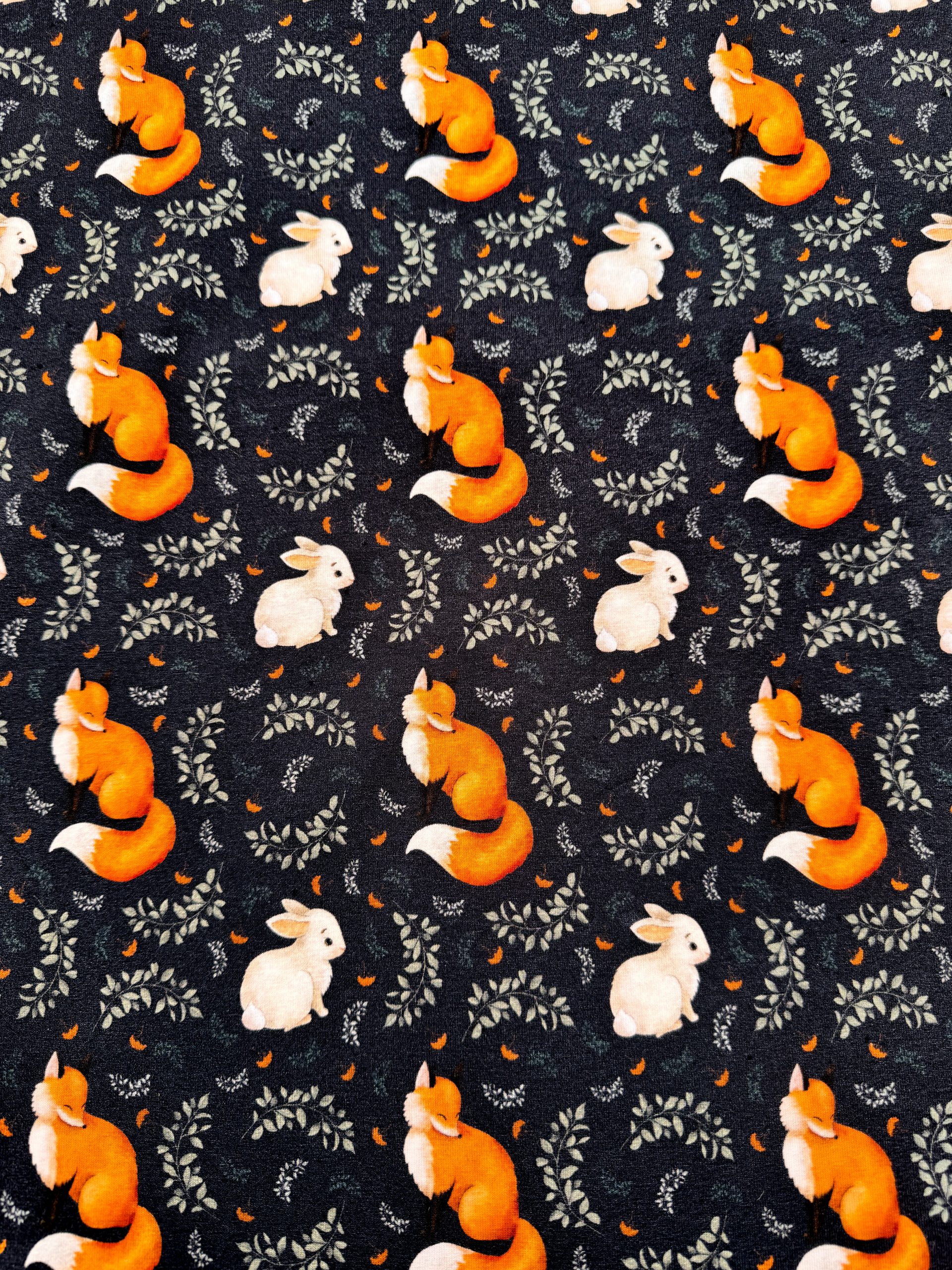 Ontdek de magie van het bos bij schemerlicht met onze Midnight Forest jersey. Deze zachte, rekbare tricotstof is bedrukt met schattige vosjes en konijntjes op een diepe, donkere achtergrond, waardoor het ontwerp een sfeervol en elegant tintje krijgt. Perfect voor baby- en kinderkleding, T-shirts, jurkjes of accessoires die comfort en speelse stijl combineren.