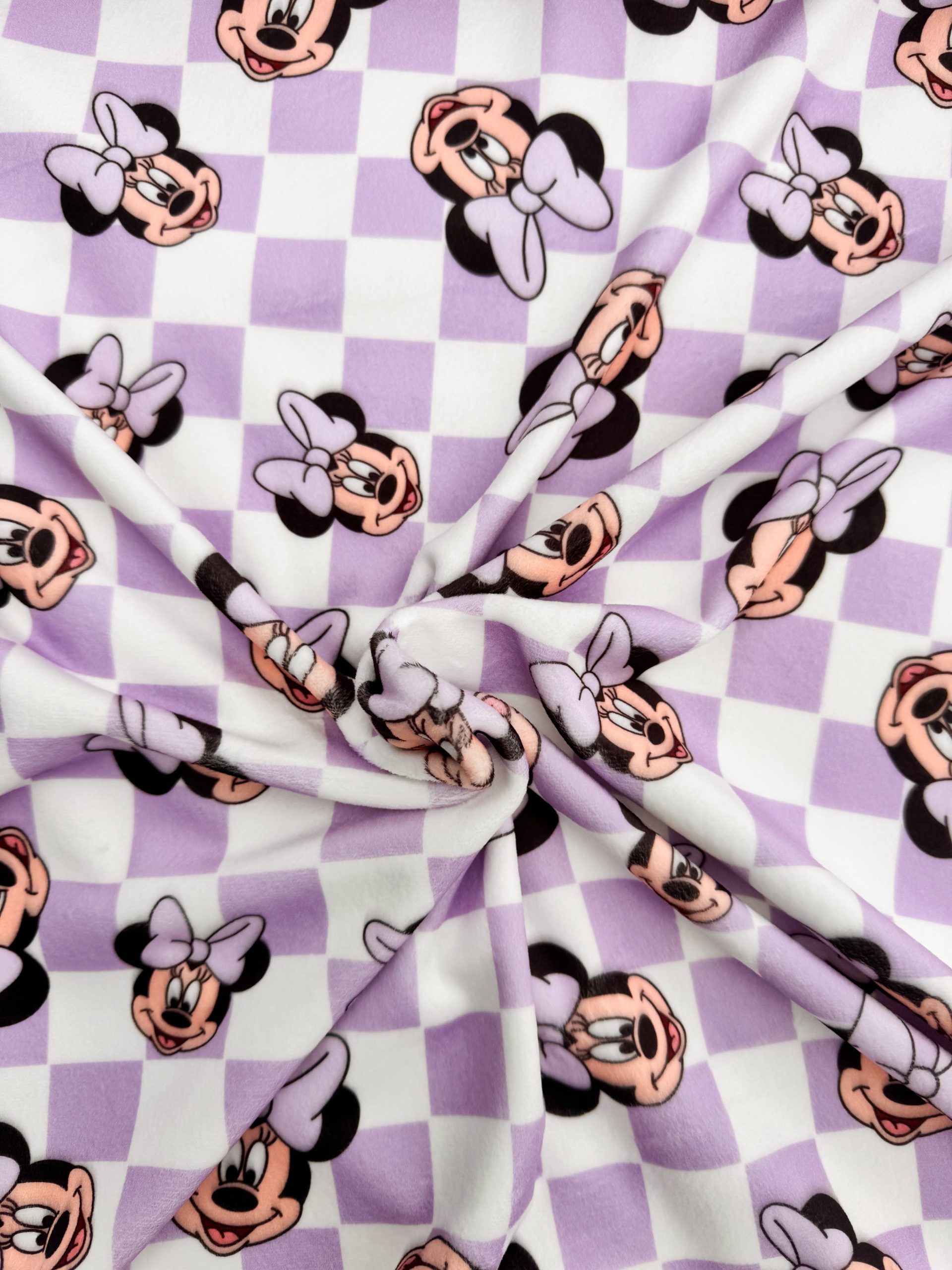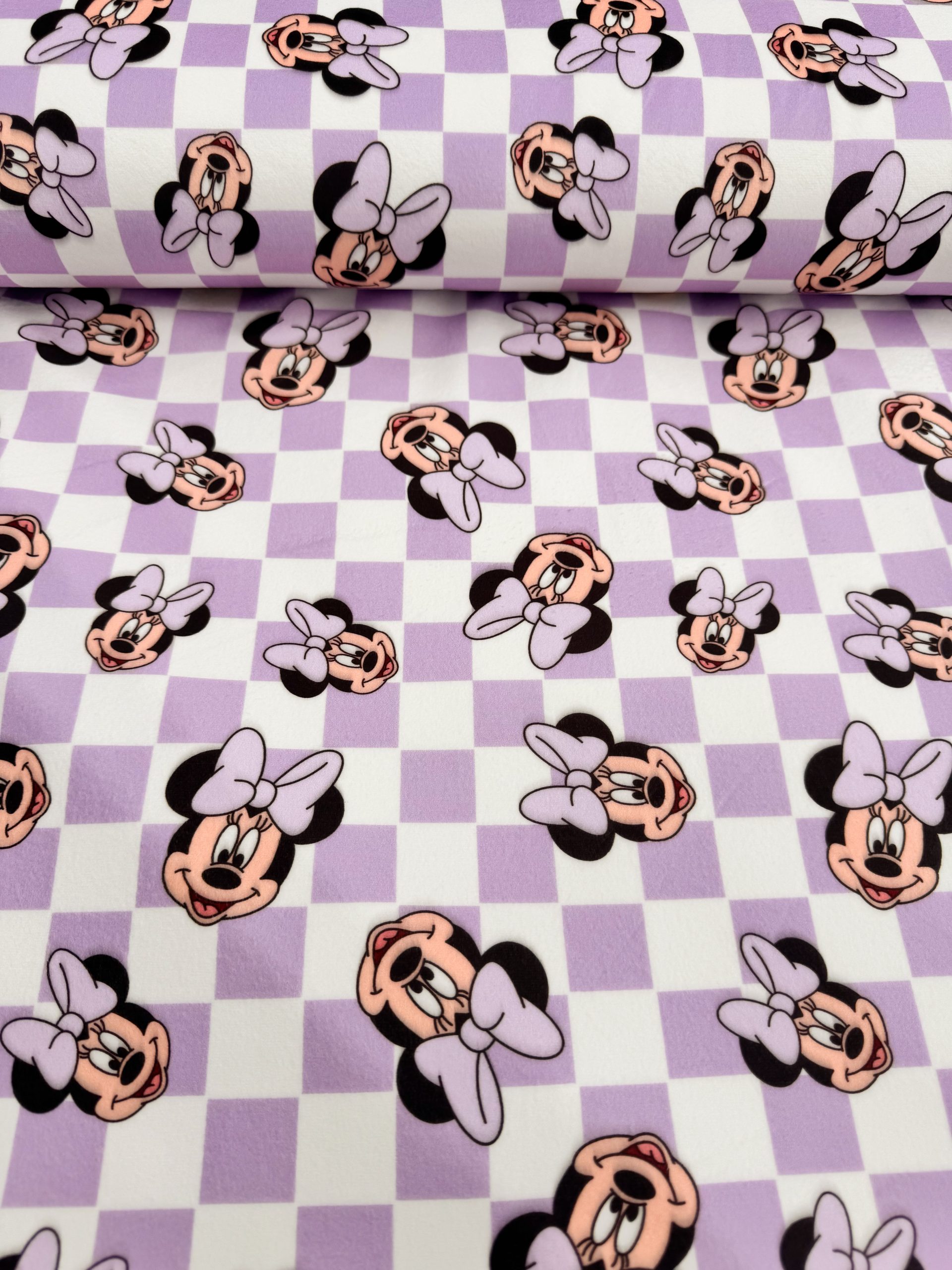 Onze velvet stof in lila met Minnie print combineert speelse charme met een luxueuze uitstraling. De zachte fluweelstructuur voelt heerlijk aan en geeft een subtiele glans, terwijl de vrolijke Minnie details zorgen voor een knipoog naar fun en nostalgie.