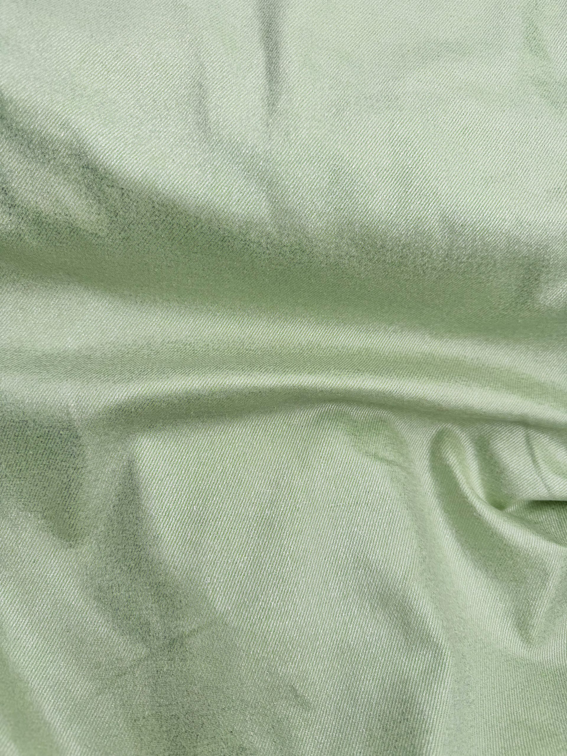 Onze lichtgroene denim met subtiele glans geeft een eigentijdse twist aan de klassieke denimlook. De frisse groene tint straalt energie en zachtheid uit, terwijl de glanslaag zorgt voor een elegante en moderne finish.