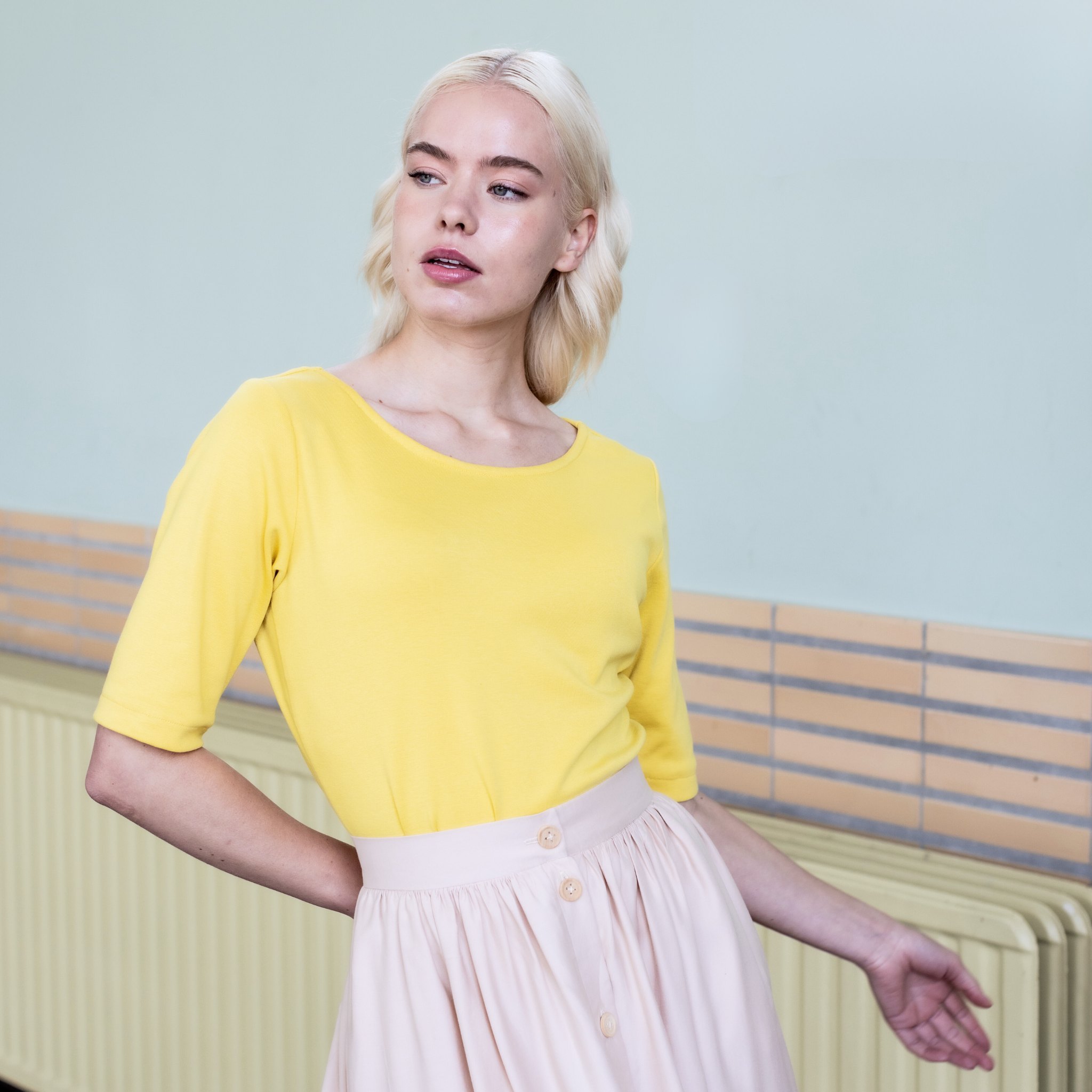 Gebruik enkel rekbare stoffen met minstens 20% stretch. Niet-rekbare stoffen zijn ongeschikt. Rekt je stof meer dan 20 à 30%, maak dan een maatje kleiner voor een mooie aansluitende pasvorm.