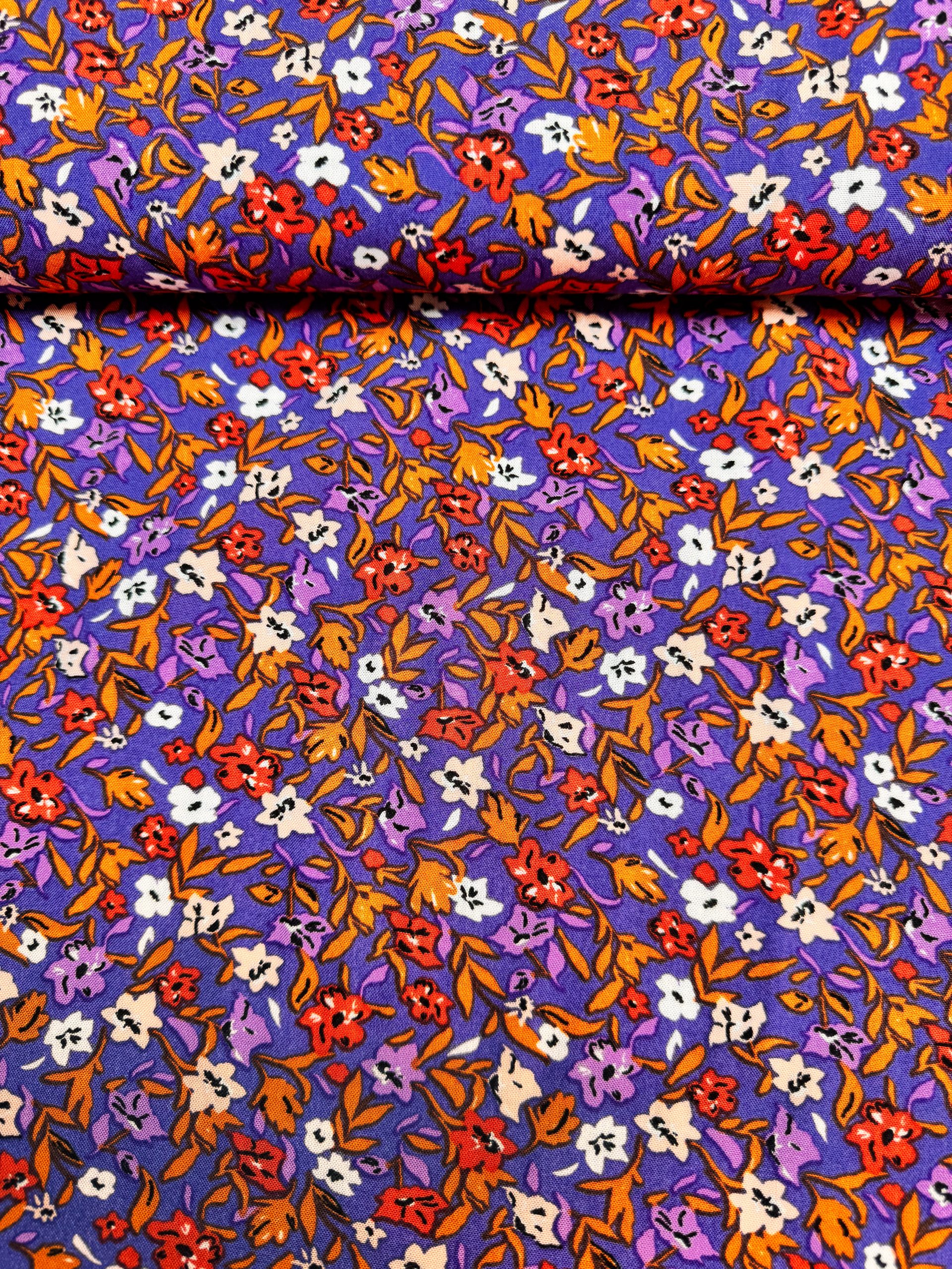 Deze paarse viscose met prachtige kleine bloemen heeft een romantische en verfijnde uitstraling. De diepe paarse tint vormt een elegante basis, terwijl de fijne bloemmotiefjes zorgen voor een speels en lieflijk detail.