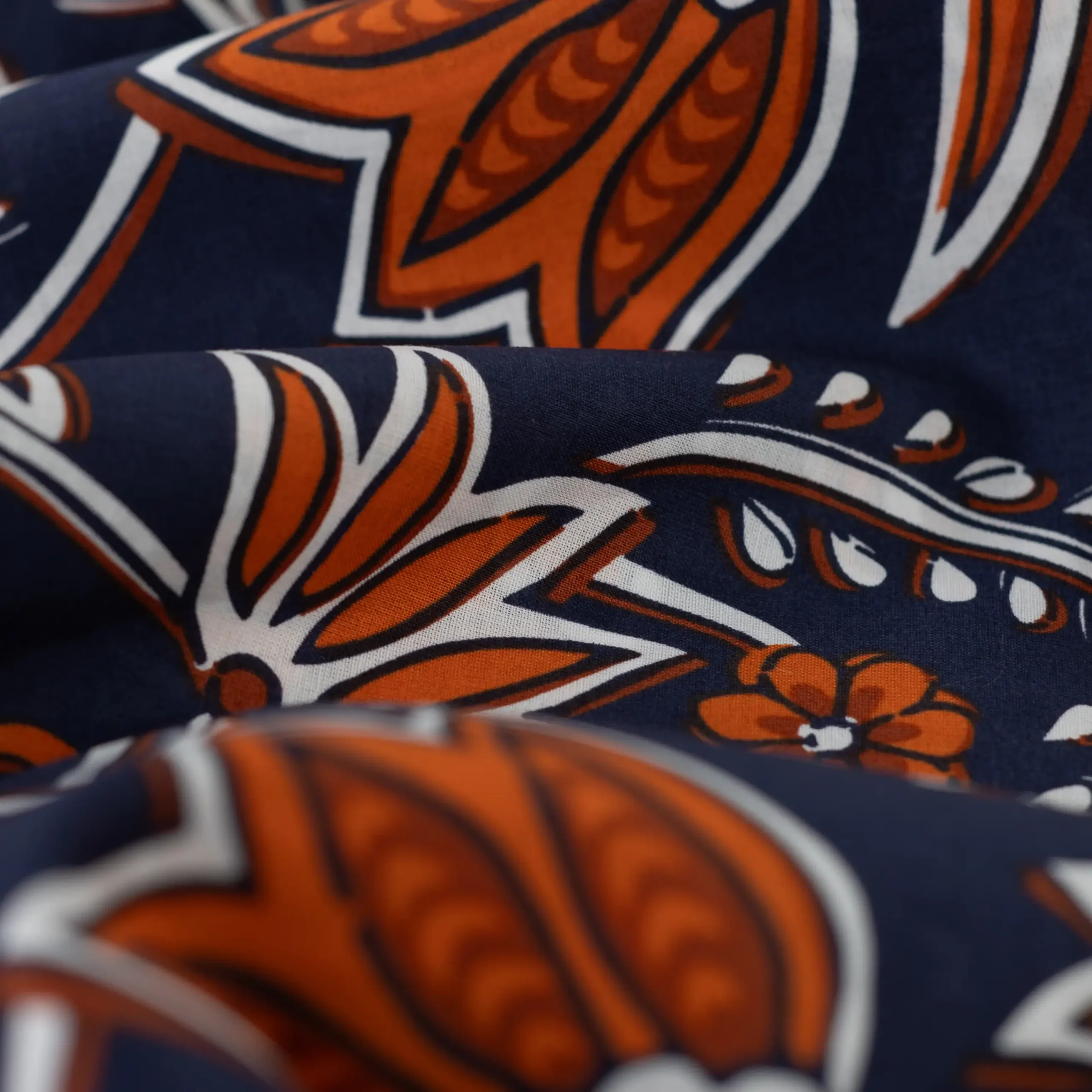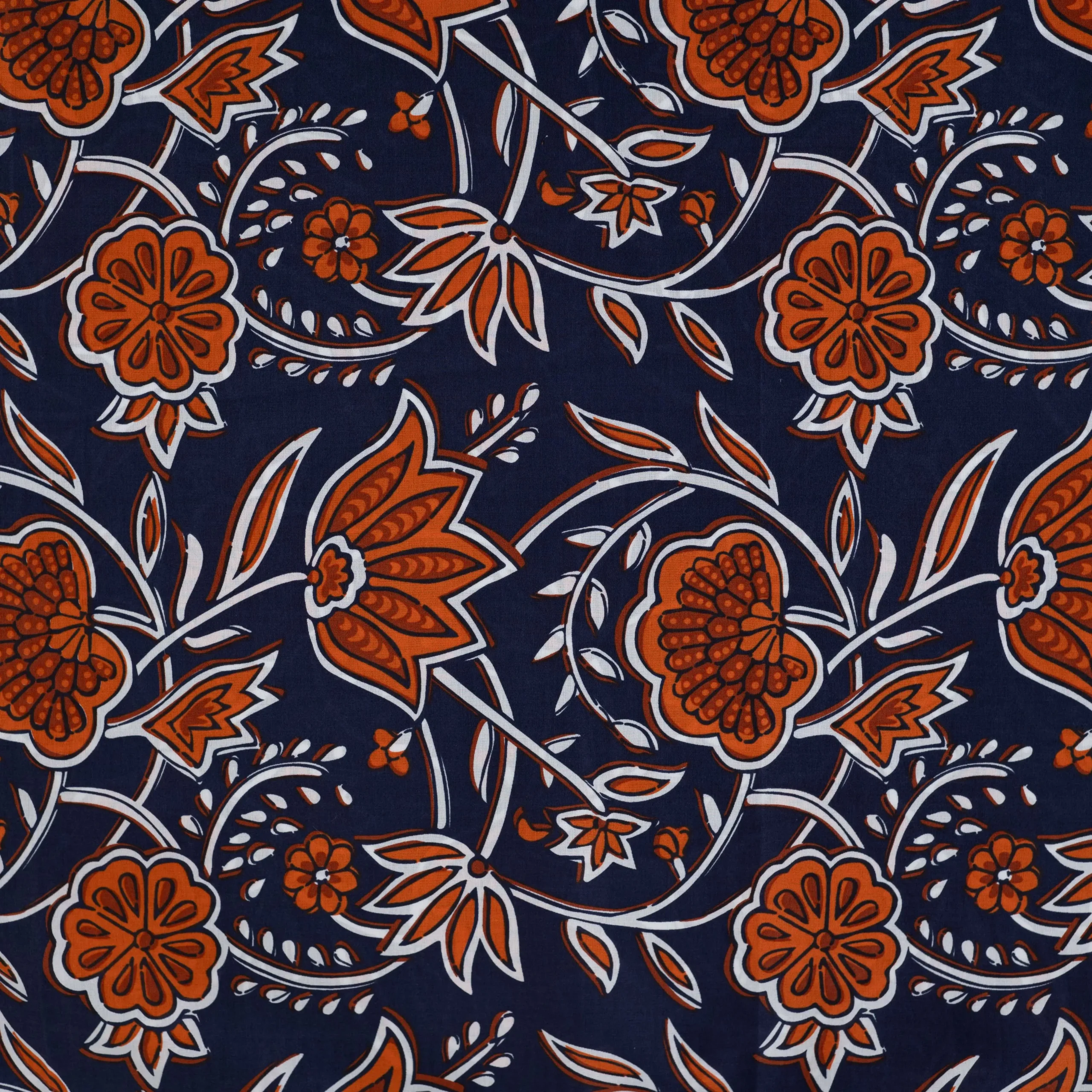 Katoen met bloemenprint in navy en roest – krachtig en stijlvol