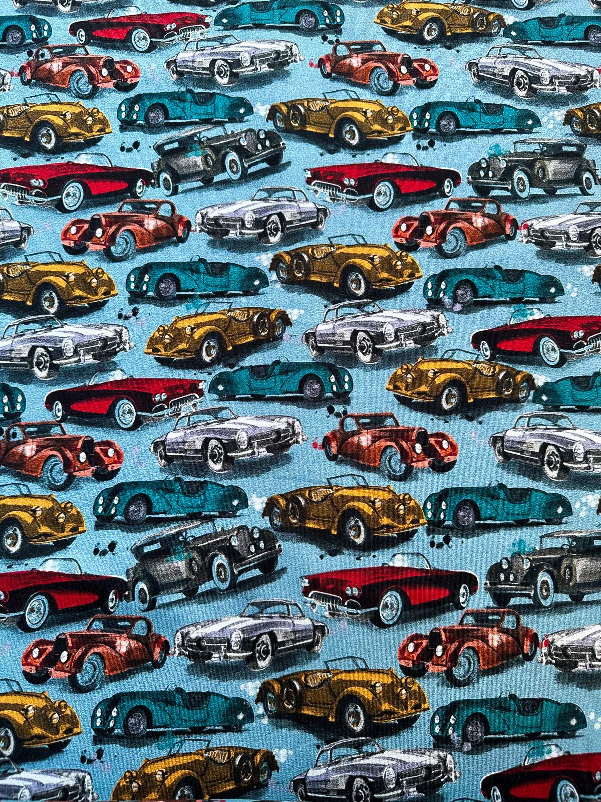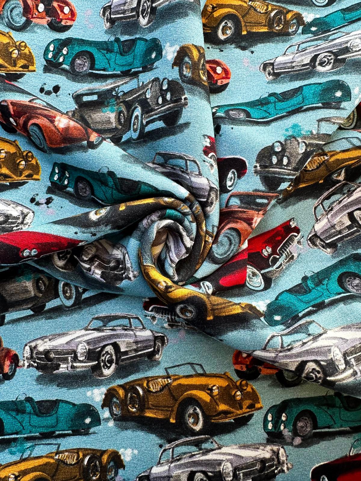 Voor kleine autoliefhebbers en stoere casual outfits: onze lichtblauwe joggingstof met een vrolijk oldtimers-motief combineert comfort en stijl. Deze zachte, rekbare stof is ideaal voor sweatpants, hoodies, vestjes of andere casual kleding die lekker zit én een speelse uitstraling heeft. De lichtblauwe kleur en de charmante oldtimers maken iedere outfit uniek en gezellig.