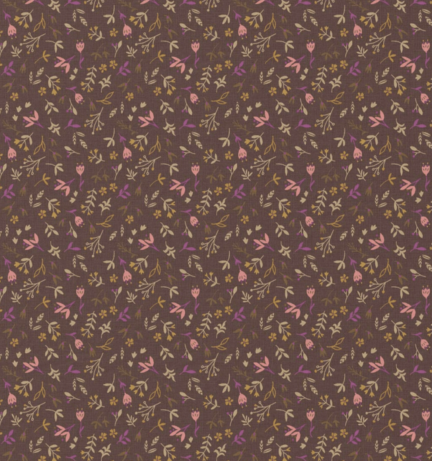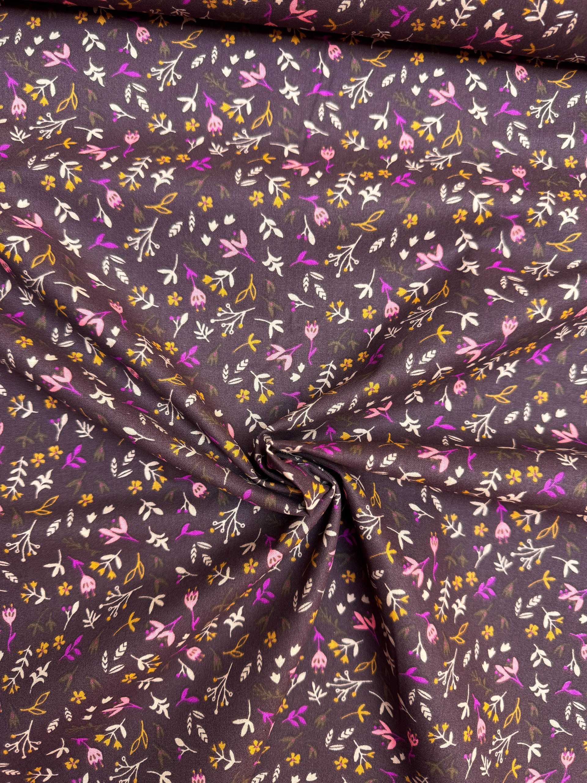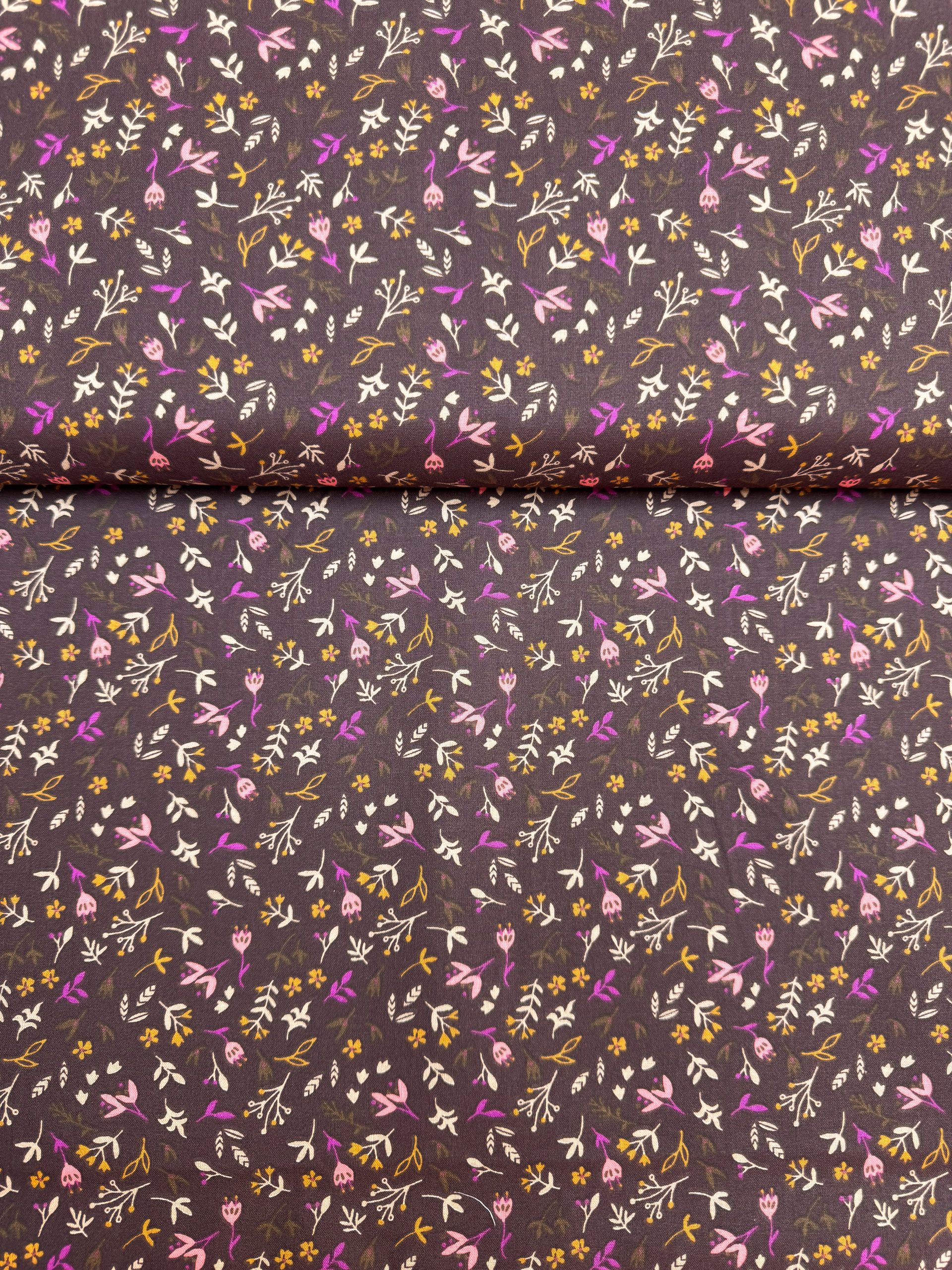 Deze katoenen stof met kleine bloemenprint op een donkerchocoladebruine achtergrond heeft een warme, vintage uitstraling. De rijke bruine tint geeft de print diepte, terwijl de fijne bloemen zorgen voor een speels en romantisch detail.