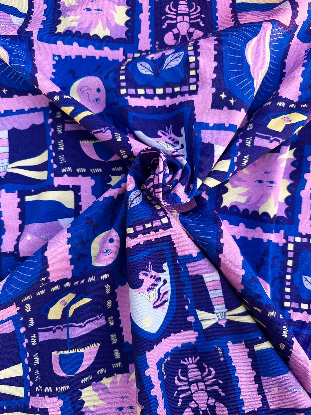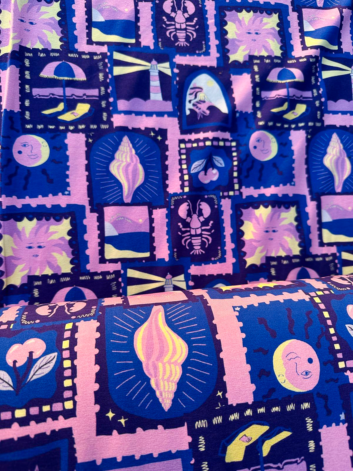 Deze vrolijke en gedetailleerde zomerprint is met liefde zelf getekend en komt nu tot leven op een heerlijk zachte reactieve jersey. De print bestaat uit fantasierijke illustraties in postzegelstijl – met kreeften, schelpen, zonnetjes, maantjes, kersen, parasolletjes en vuurtorens – allemaal in een kleurrijk palet van kobaltblauw, lila, roze en pastelgeel.