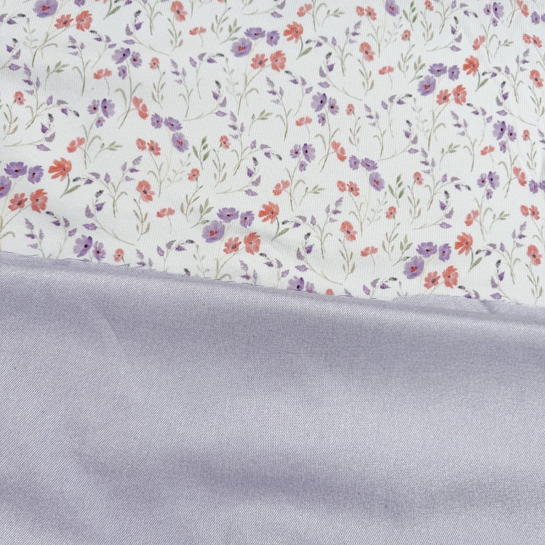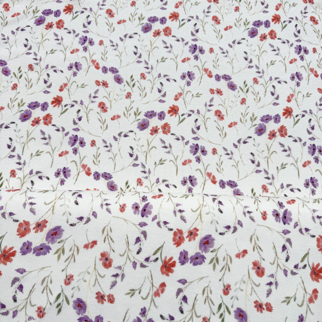 Het bloemenpatroon in paars- en lavendeltinten geeft een vrouwelijke en romantische uitstraling, perfect voor kledingstukken als shirts, jurken, tops, babykleding of comfortabele loungewear. Dankzij de witte basis komen de bloemen extra mooi tot hun recht en laat de stof zich makkelijk combineren met andere kleuren.