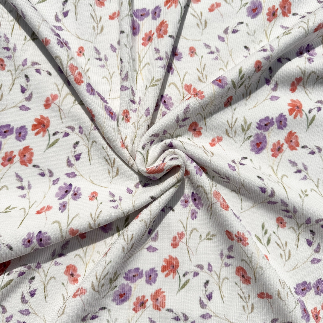Breng kleur en elegantie in je creaties met deze prachtige ribjersey in floral purple dessin op een frisse, witte achtergrond. Deze stof combineert comfort en stijl, met een fijne ribstructuur die zorgt voor een mooie stretch en een flatterende pasvorm.