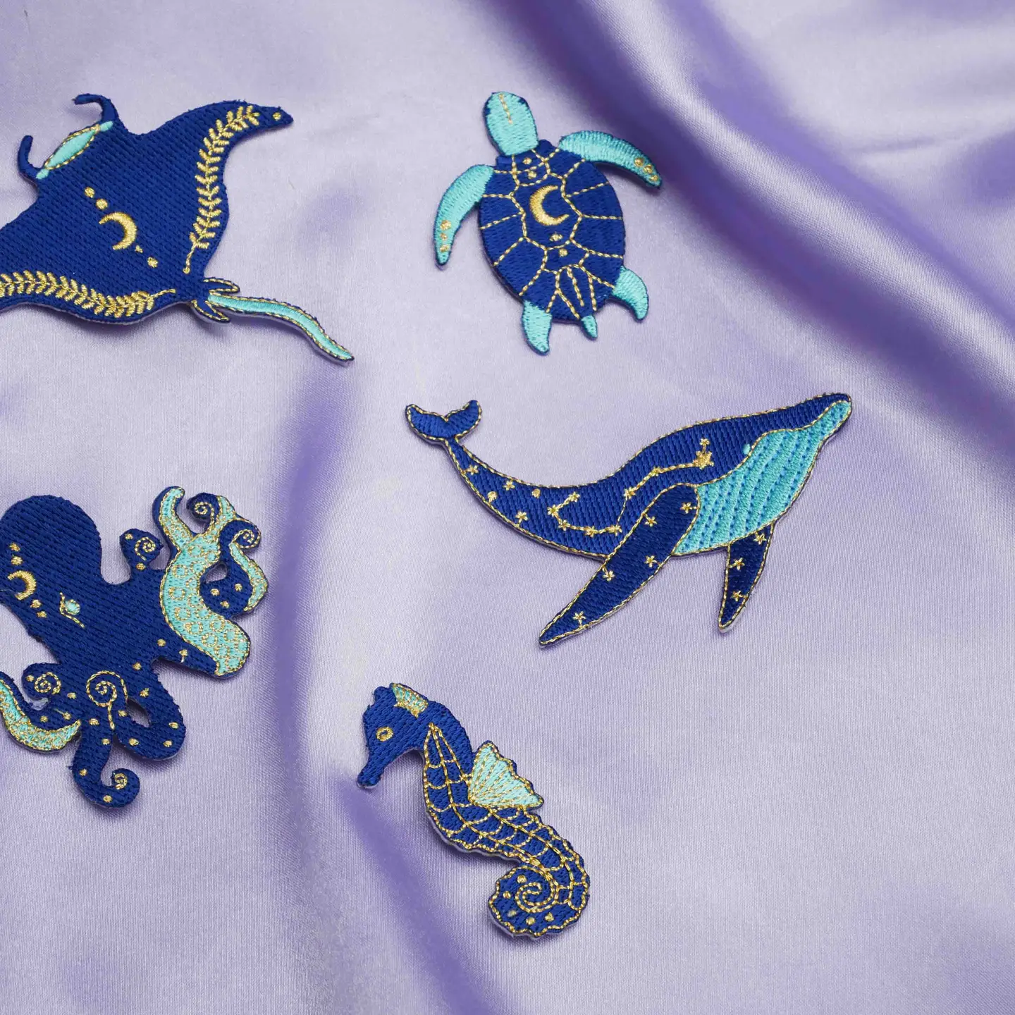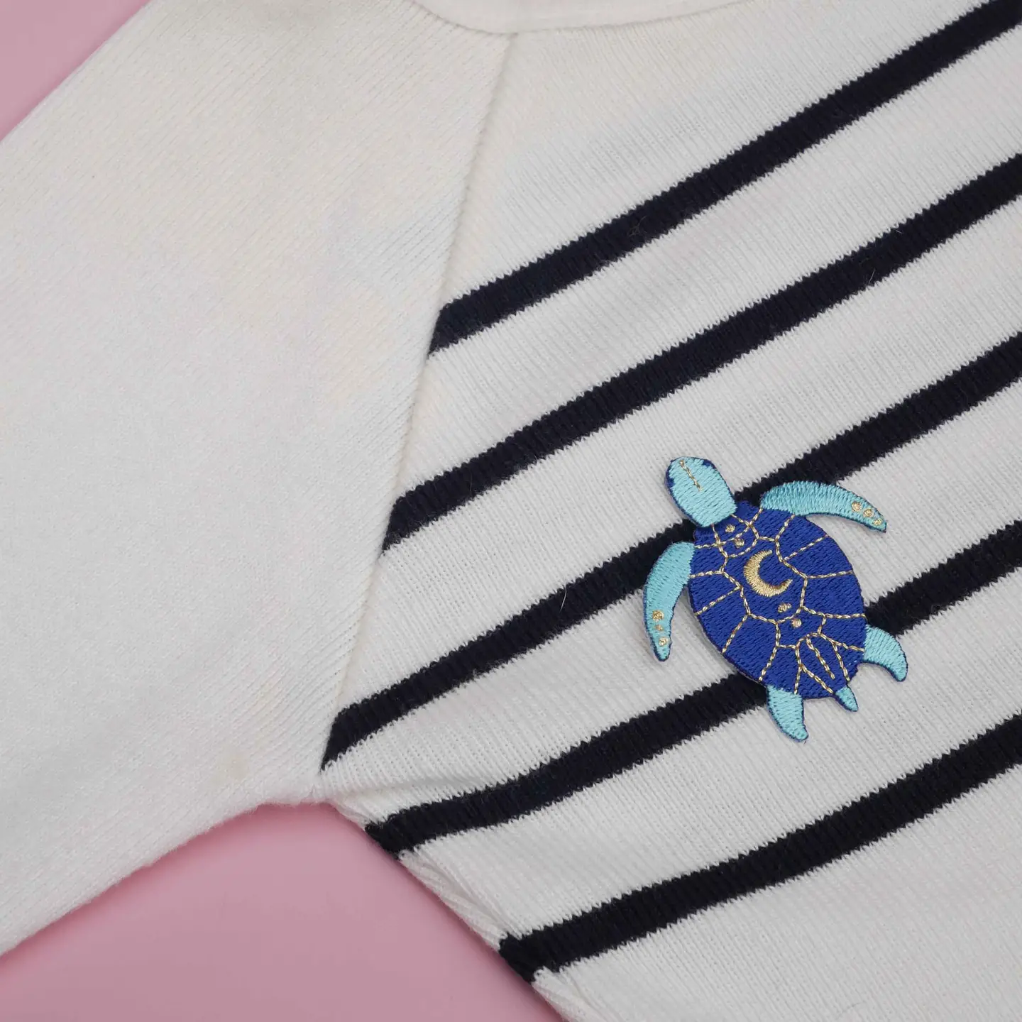 Schildpadden collectie « Gold Dreamer » Duik in een magische oceaan met deze prachtige strijkapplicatie van een zeedier in middernachtblauw en goud. Het is de perfecte detail om jouw outfits te verfraaien. Pssst, het handige is dat je het er gewoon met een snelle strijkbout op kunt bevestigen, makkelijker kan niet!