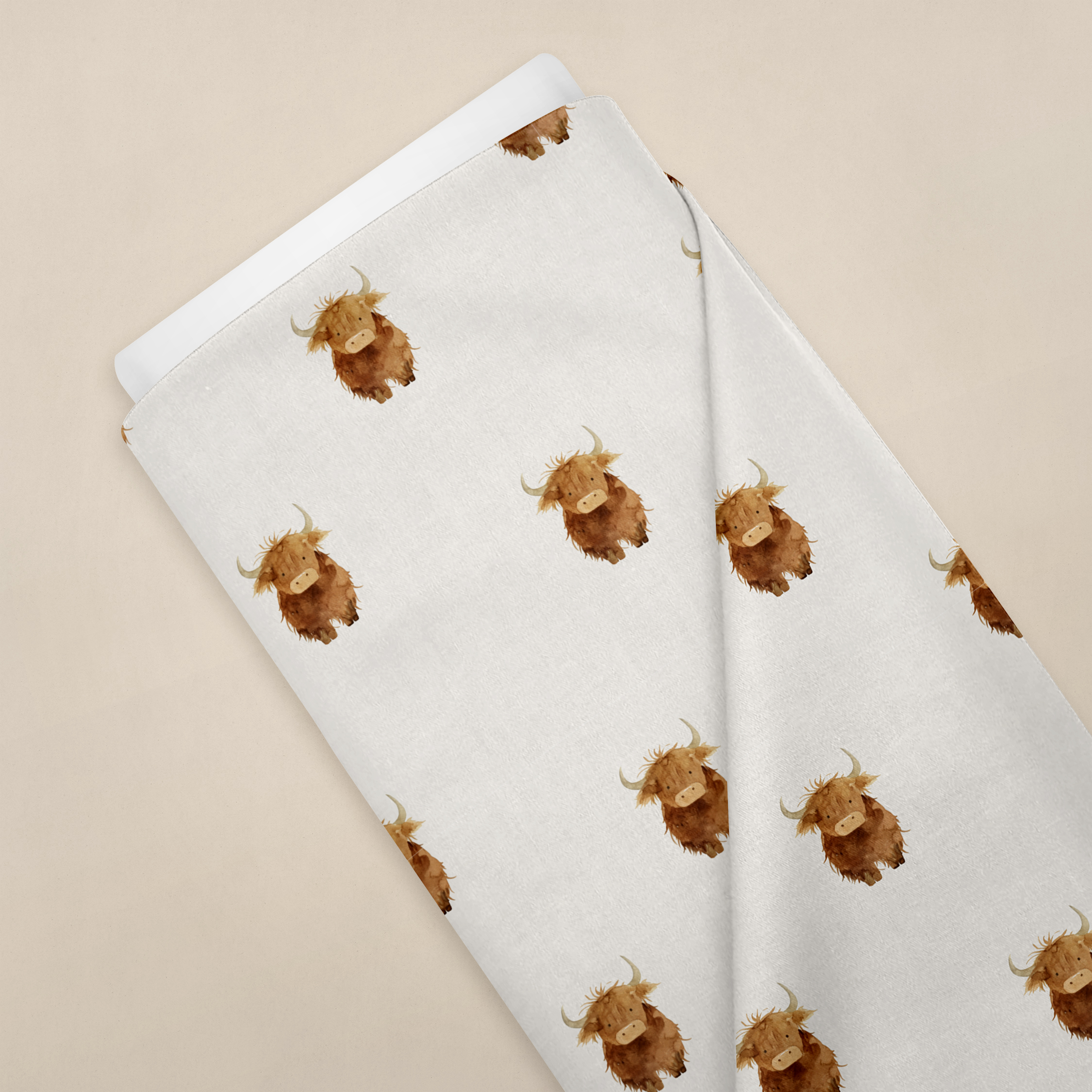 Dit stoere design met Schotse Hooglanders is een echte blikvanger! De lieve runderen met hun kenmerkende lange vacht en imposante horens geven de stof een speelse én robuuste uitstraling, perfect voor jong en oud.