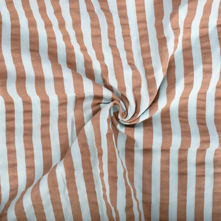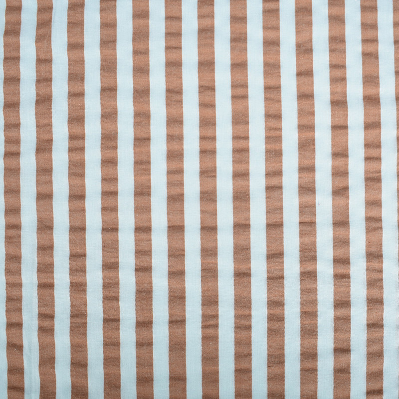 Seersucker striped mint caramel is een stijlvolle en zomerse stof met een tijdloos streeppatroon in frisse minttinten gecombineerd met warme karamelkleuren. Deze unieke kleurencombinatie zorgt voor een mooi contrast tussen koel en warm en geeft de stof een moderne, speelse en tegelijkertijd elegante uitstraling.