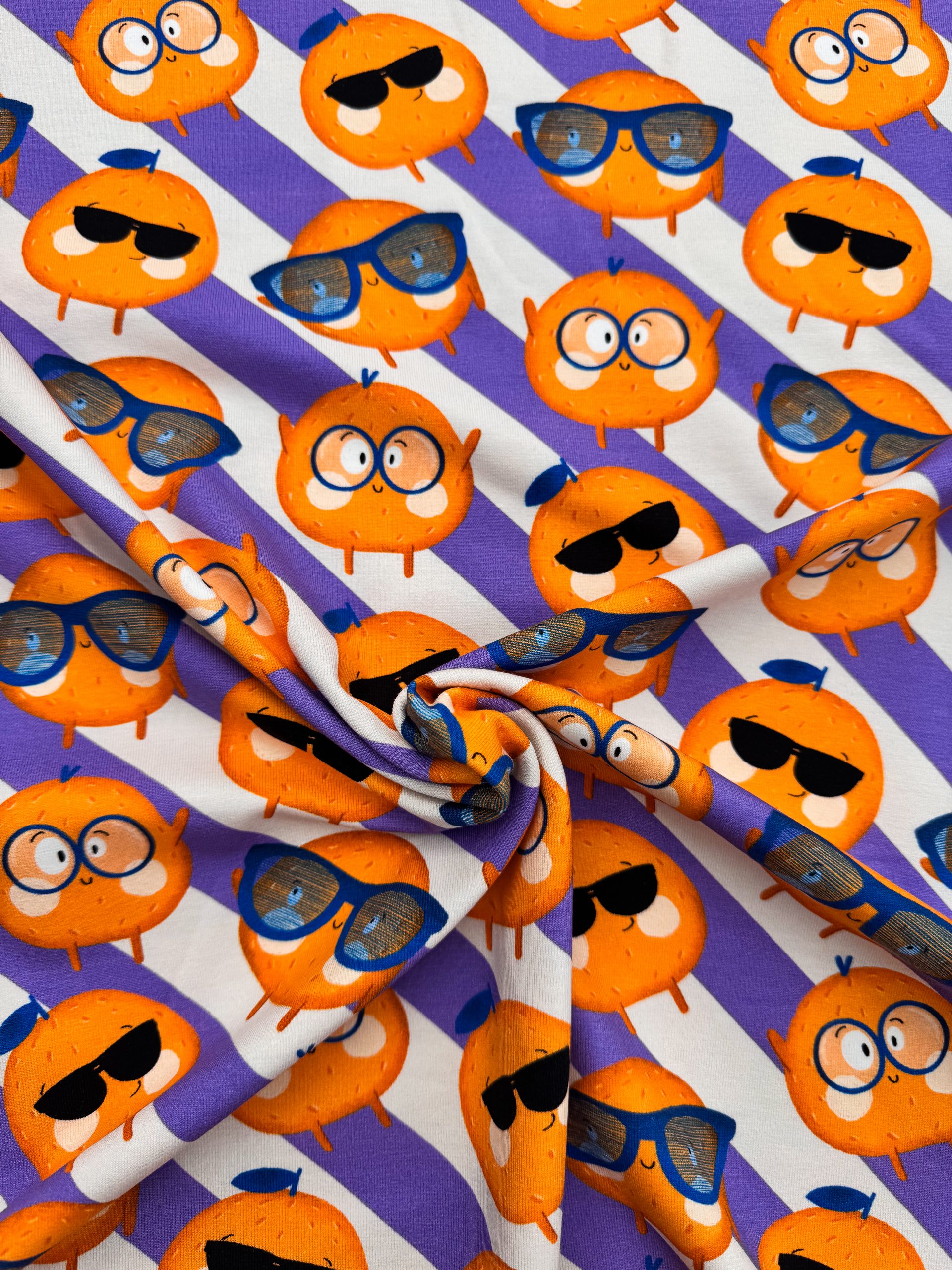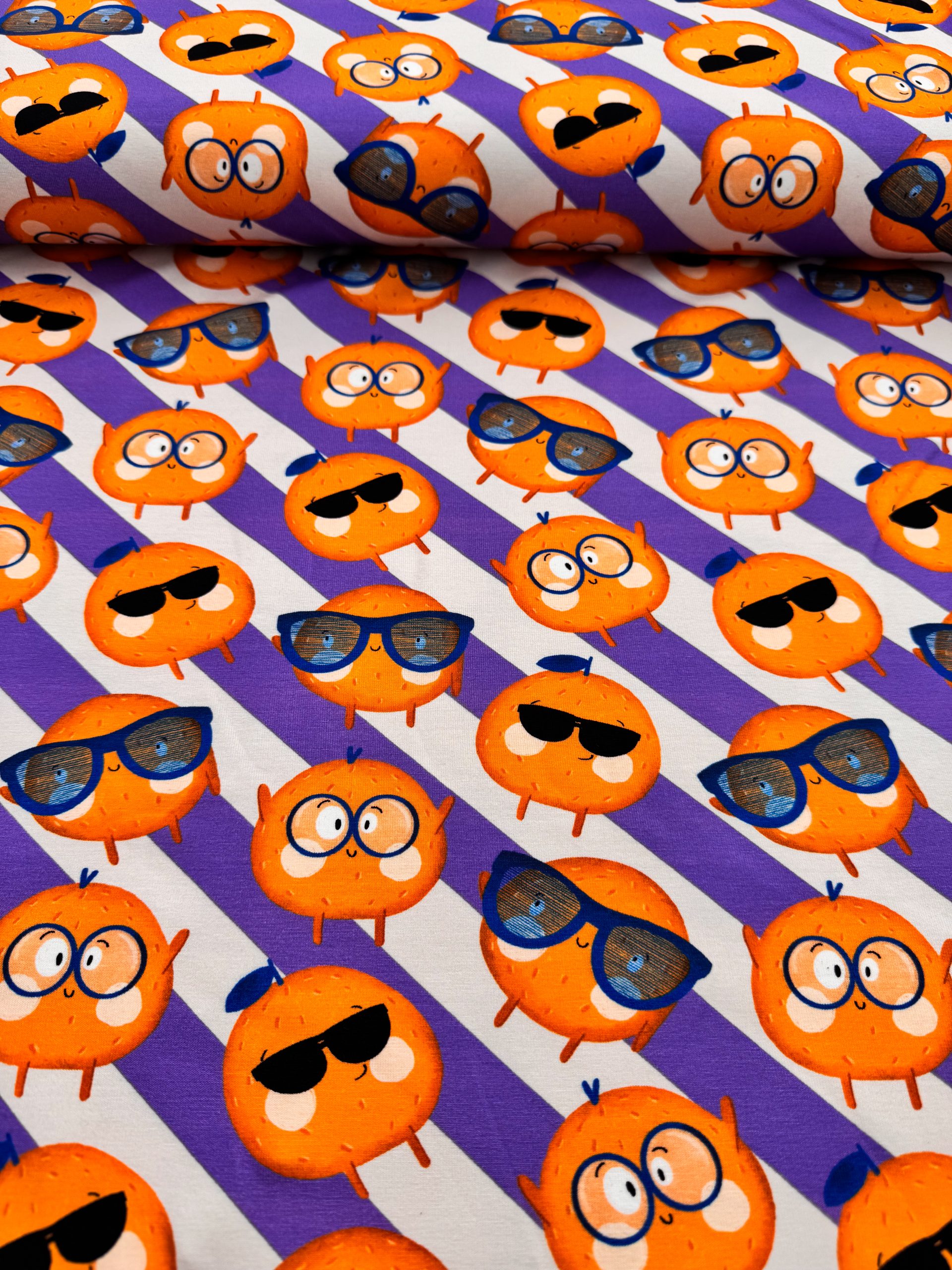 Zin in een dosis vitamine C voor je outfit? Deze stof met leuke sinaasappels op paarse strepen is een echte showstopper in onze Food Party Capsule. De frisse oranje vruchten spatten van het diepe lila streeppatroon af – een onverwachte en vrolijke combinatie die meteen een glimlach oproept.