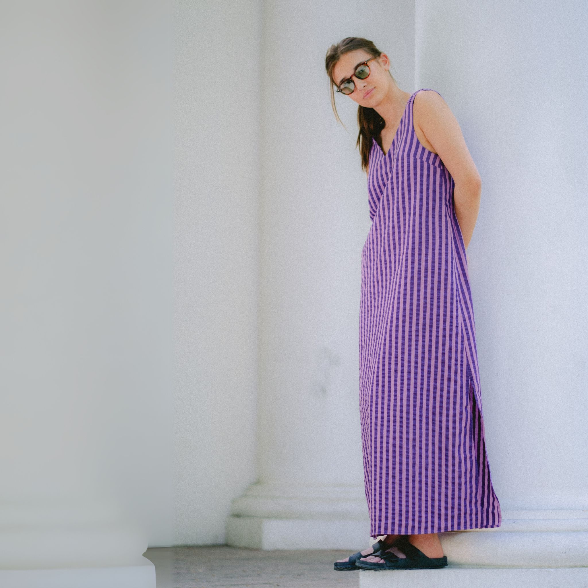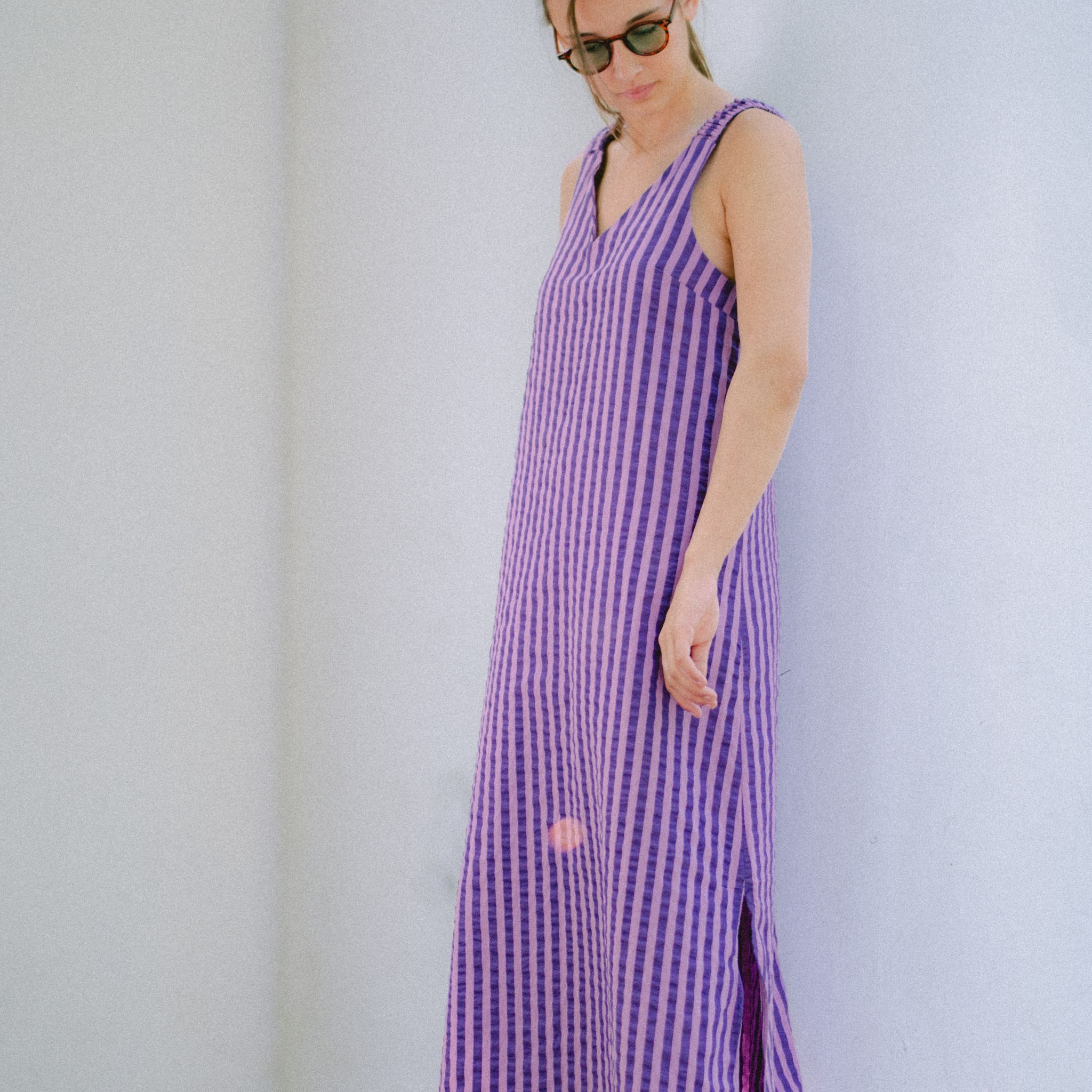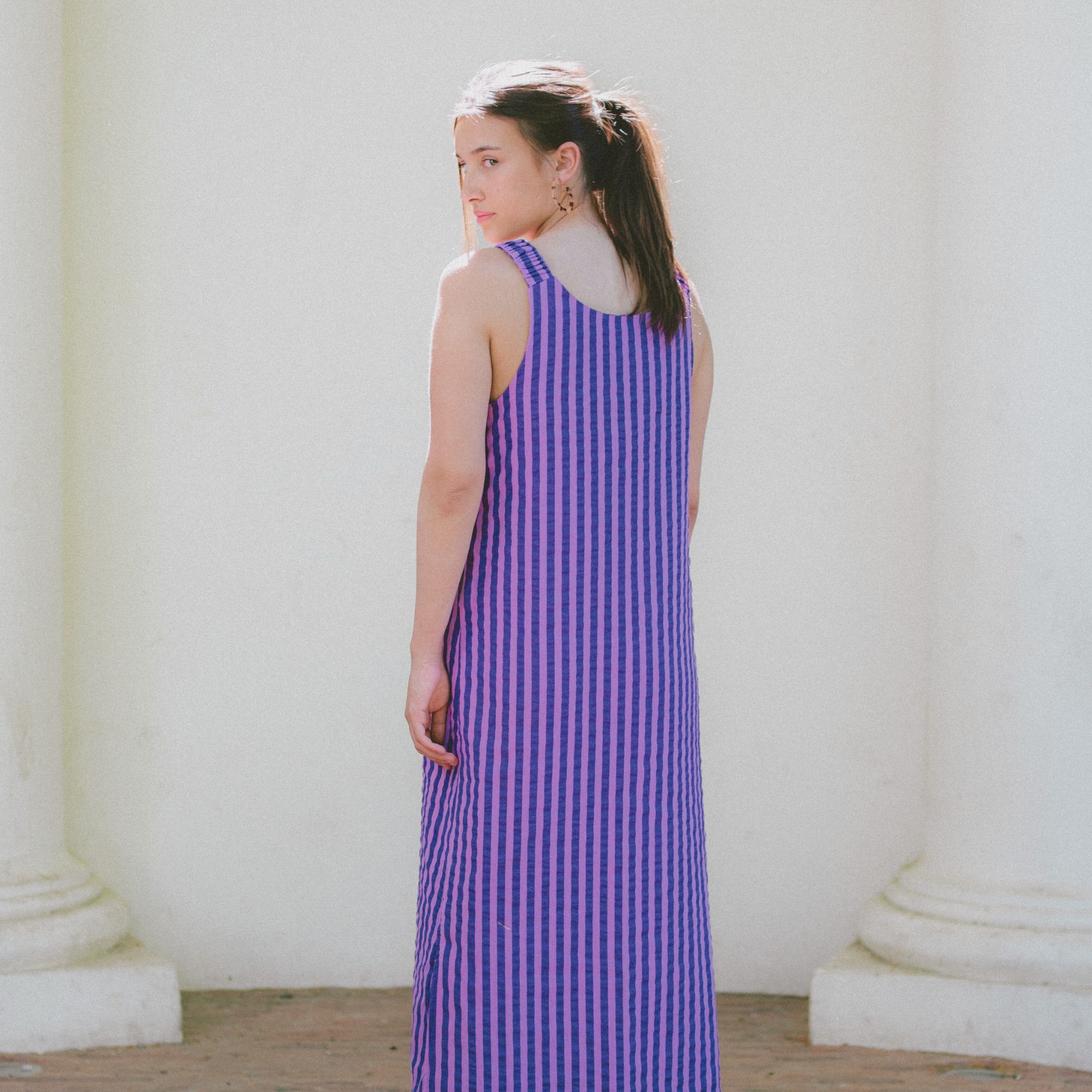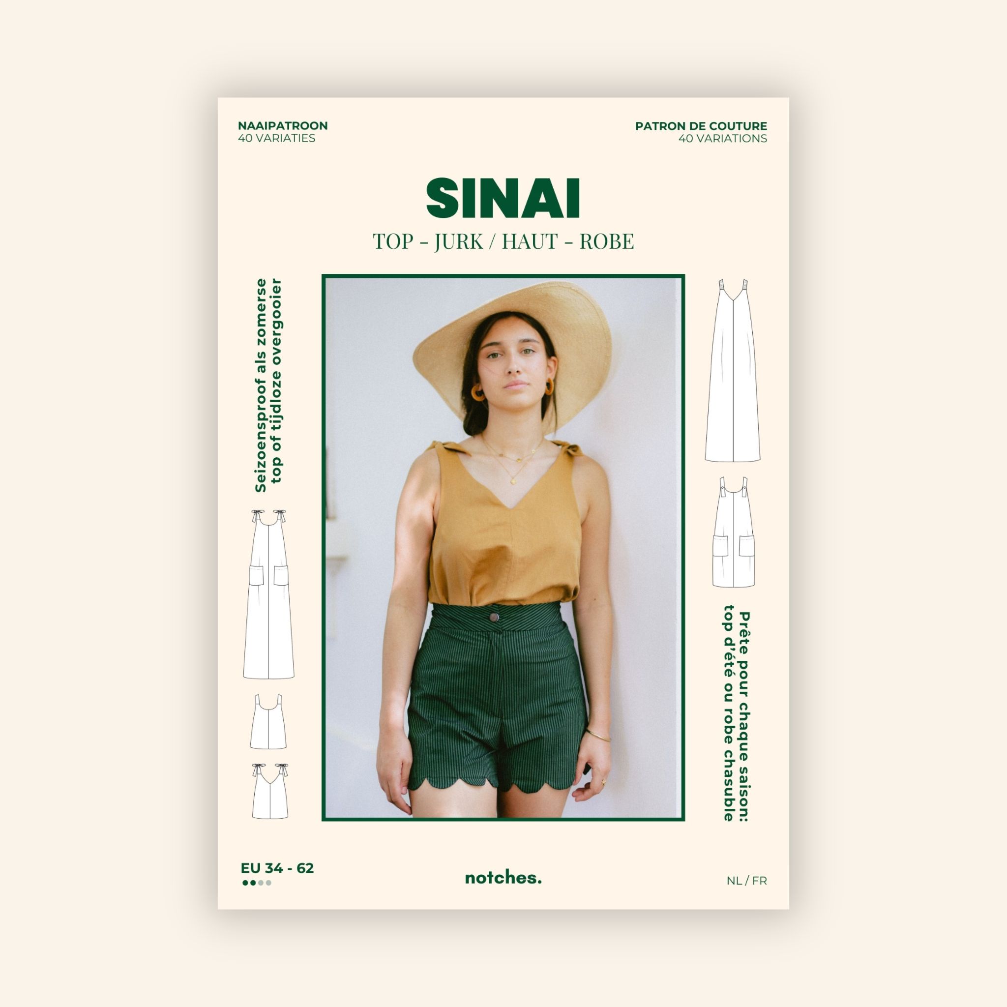 Sinai is een luchtige A-lijn jurk of top met een losse pasvorm, diepe ronde uitsnijding op de rug en speelse opties voor schouderbandjes en halslijnen. Je kunt kiezen voor een ronde hals of V-hals en de bandjes afwerken met lintjes, knoopjes, elastiek of netjes ingewerkt. Dankzij drie verschillende lengtes – top, korte jurk of maxi – én optionele zijsplitten bouw je makkelijk een capsulecollectie rond dit ene patroon. Perfect voor zomerse dagen op blote schouders, maar net zo mooi in laagjes gedragen als overgooier over een T-shirt of longsleeve. Sinai is stijlvol, comfortabel én snel klaar – ideaal voor beginners én ervaren naai(st)ers die houden van afwisseling.