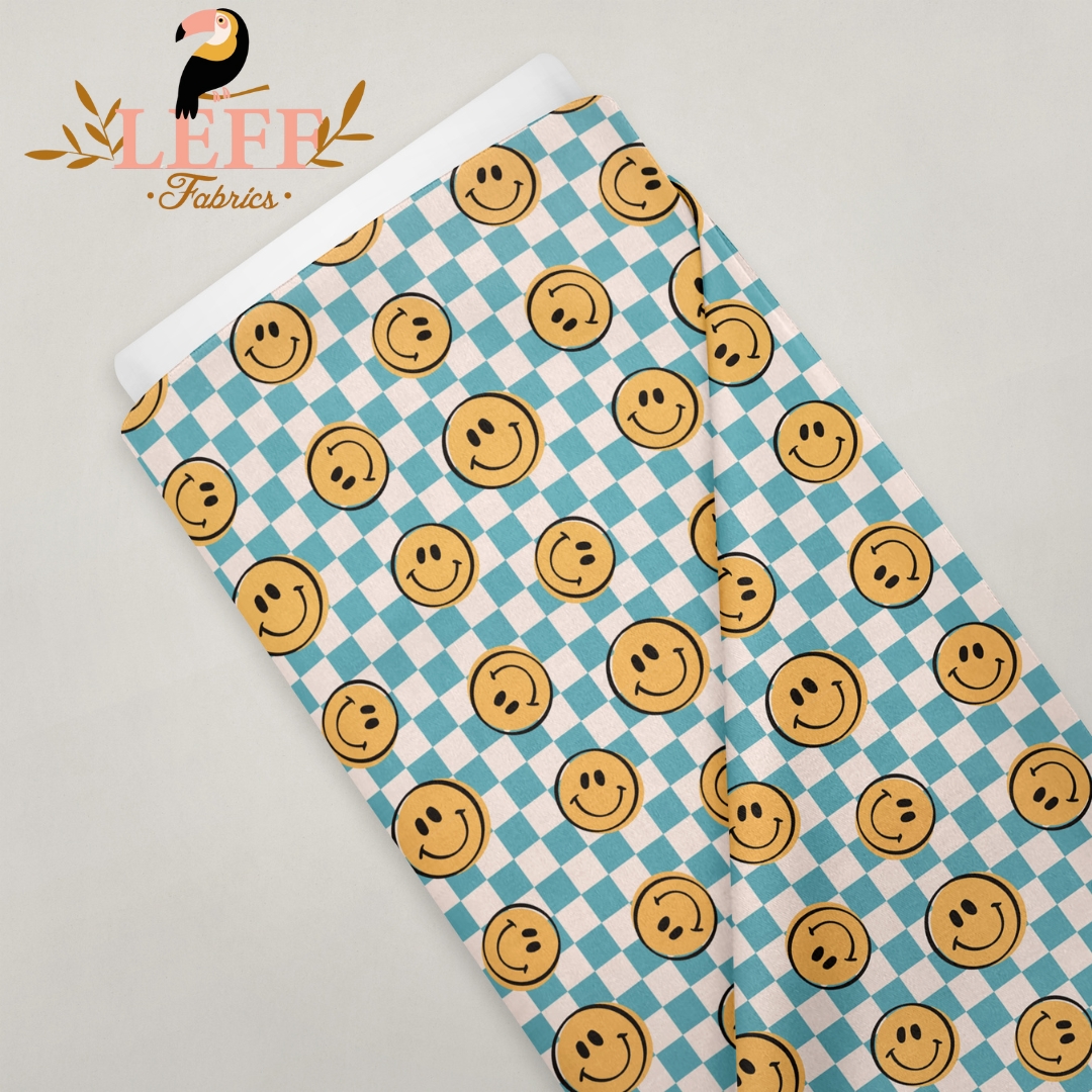 Deze jersey stof met smileys op blokjes is dé perfecte mix van speels en cool! De combinatie van grafische blokjes met vrolijke smiley’s geeft deze stof een eigentijdse, positieve uitstraling die meteen een glimlach op je gezicht tovert. Ideaal voor kids én volwassenen die van een vrolijke, beetje funky stijl houden.
