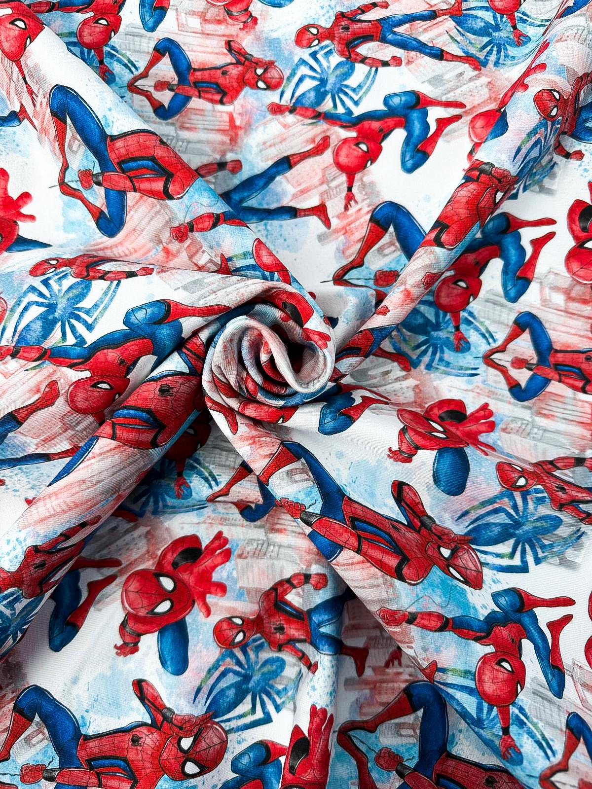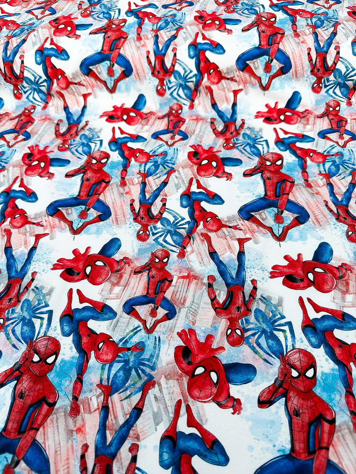 Voor alle superhelden in de dop: deze stoere jersey stof met Spiderman print is een absolute favoriet! Vol actie, beweging en heldhaftige poses spat Spidey van de stof af. De dynamische print in rood en blauw op een witte ondergrond geeft een energieke en speelse uitstraling, perfect voor kinderen die dol zijn op avontuur.