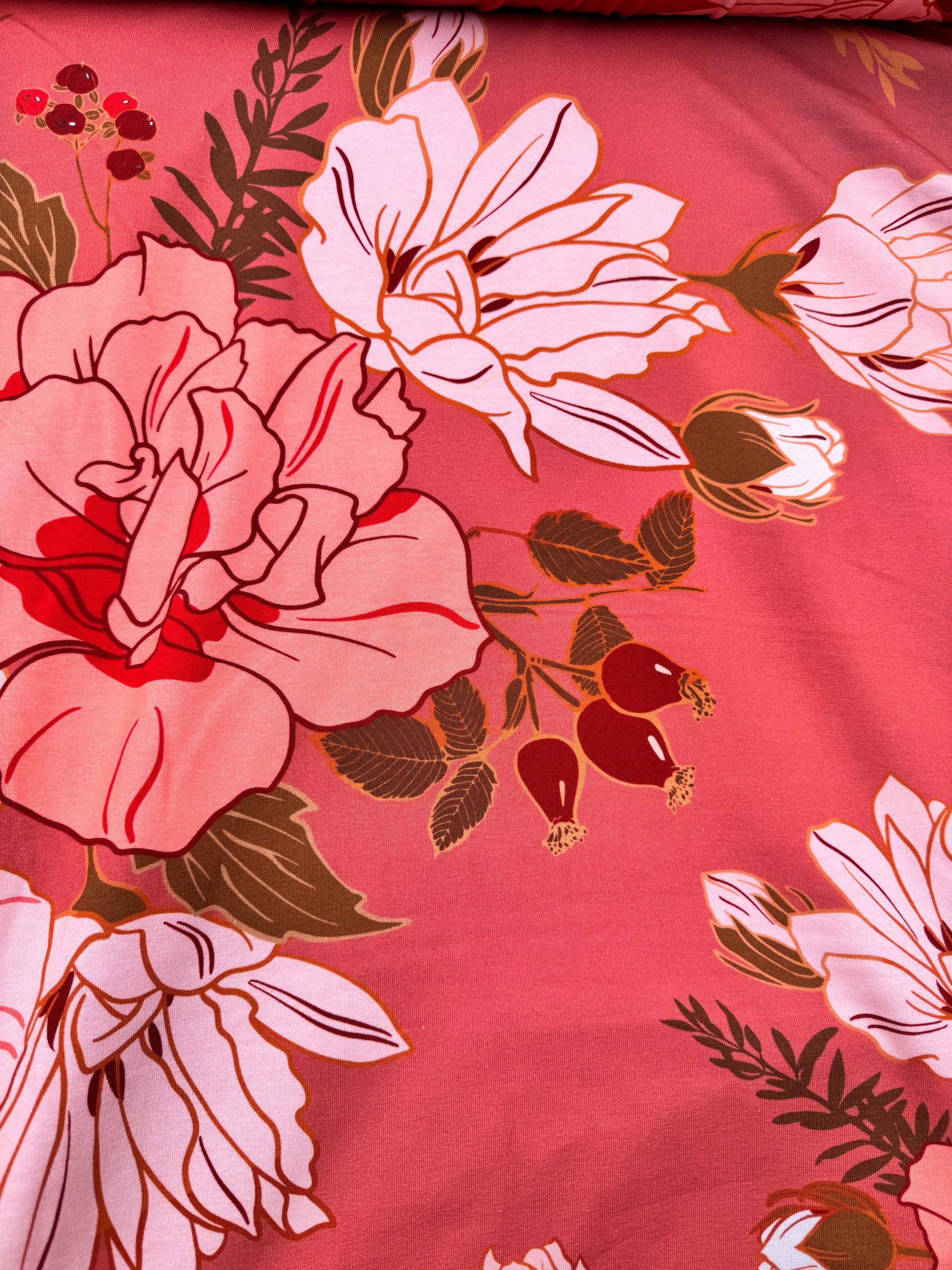 Breng de zomer tot leven met onze Summer Bloom jersey. Deze lichte, rekbare stof is versierd met een expressieve bloemenprint in zonnige kleuren – perfect voor jurken, tops, rokjes of luchtige zomeroutfits. De soepele jersey voelt heerlijk zacht aan op de huid en biedt optimaal draagcomfort, zelfs op warme dagen.