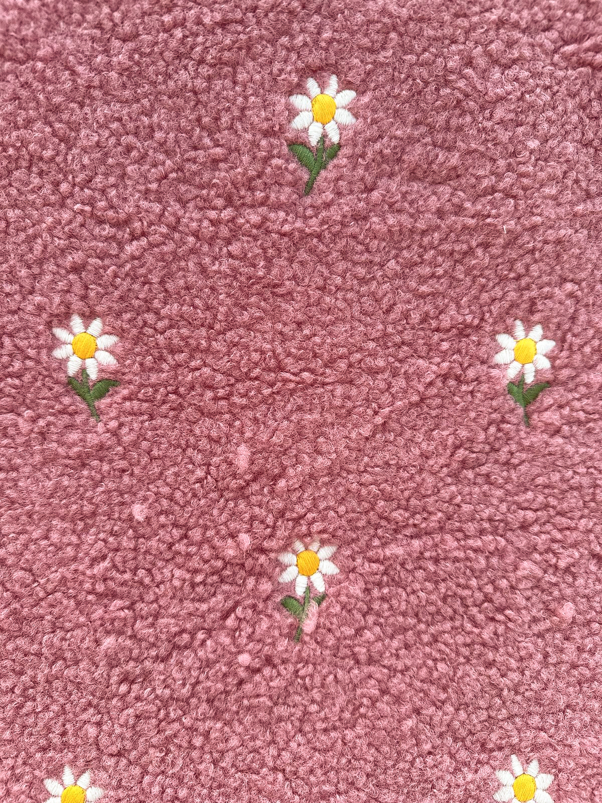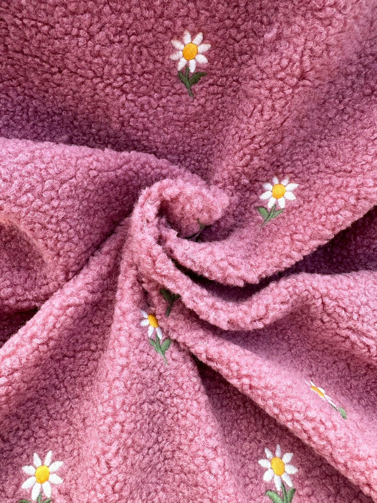 Onze teddy stof met bloemen in oudroze is de perfecte mix van cozy comfort en vrouwelijke charme. Het zachte teddy-materiaal voelt heerlijk warm aan, terwijl het subtiele bloemenmotief de stof een speelse, romantische uitstraling geeft.