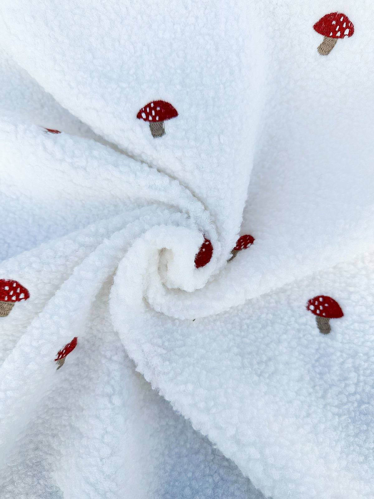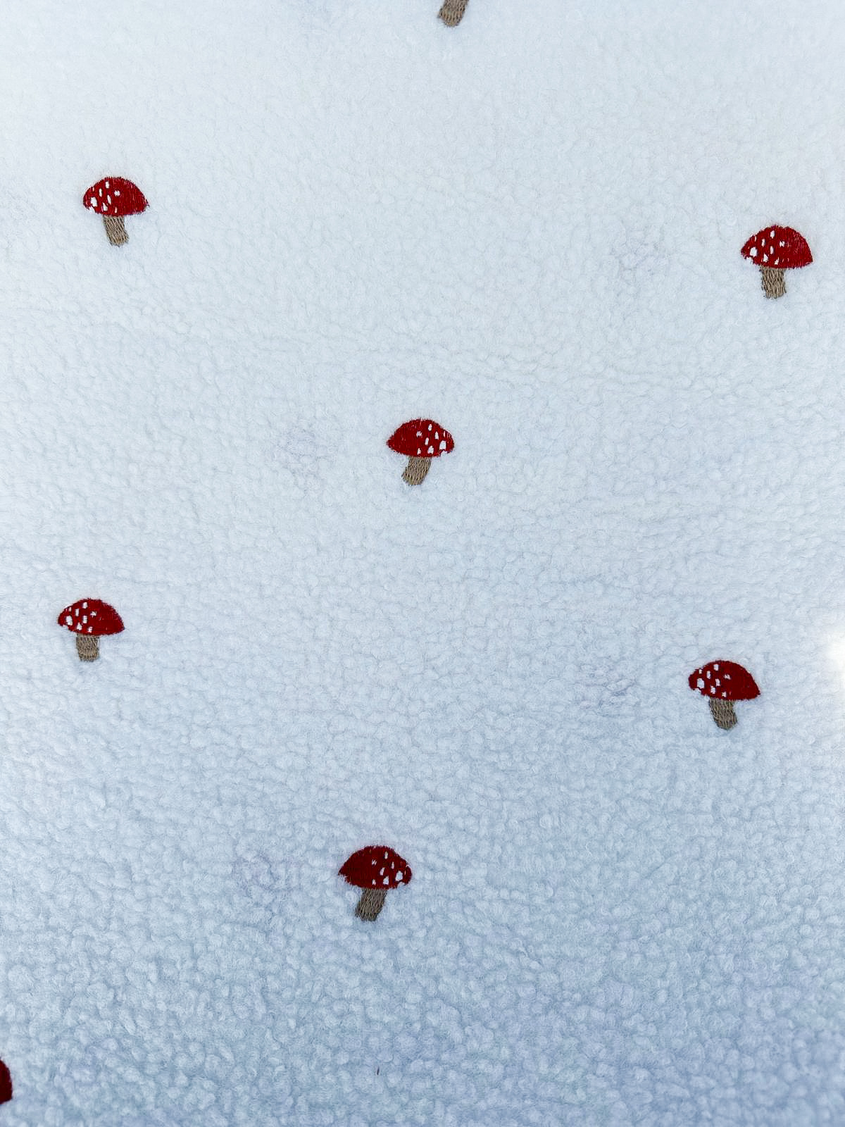 Onze teddy stof met paddenstoelen in wit brengt het bos tot leven in een zachte, frisse look. Het fluffy teddy-materiaal voelt heerlijk warm en comfortabel aan, perfect voor cozy truien, jasjes, dekentjes of accessoires.