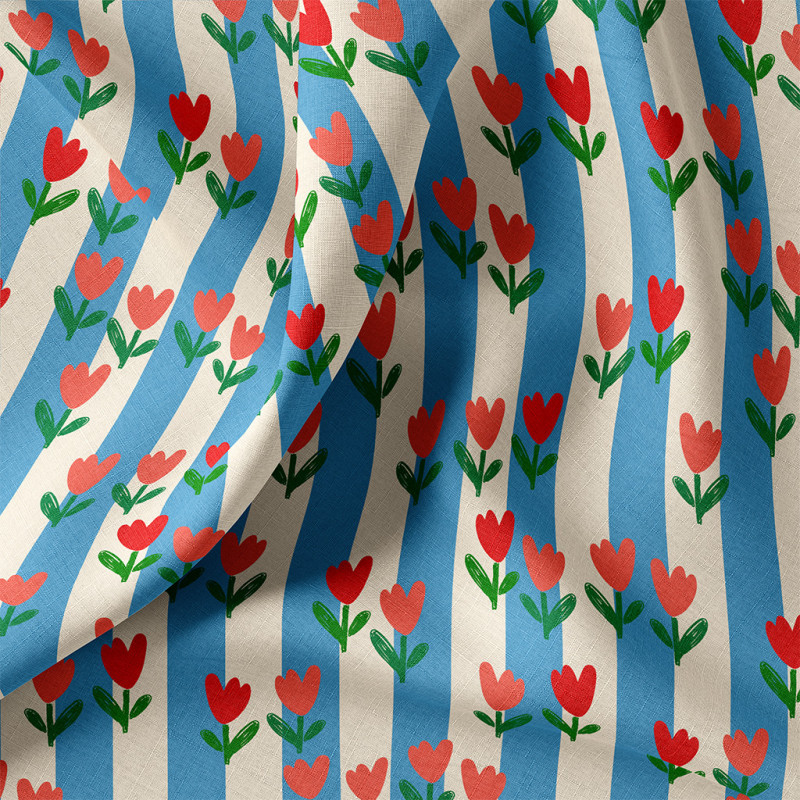 Deze katoenen stof met tulpjes en blauwe strepen op offwhite combineert een frisse streep met een speels bloemendessin. De fijne tulpjes geven de stof een subtiele, landelijke uitstraling, terwijl de blauwe strepen zorgen voor een tijdloze basis.