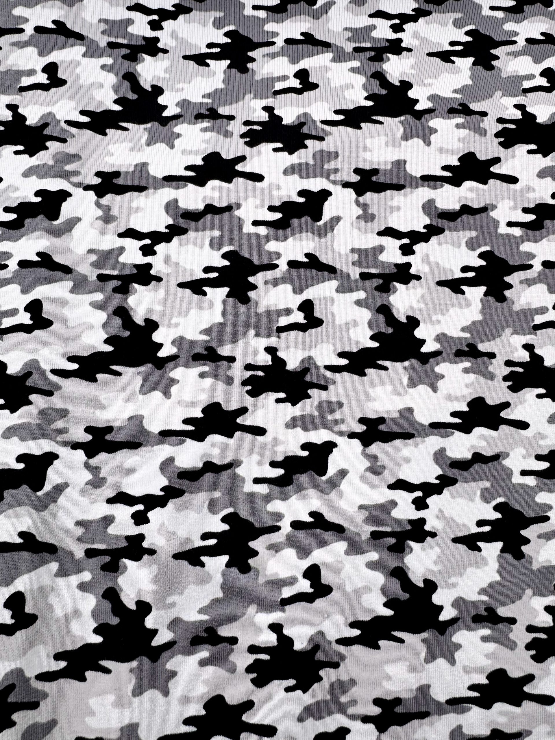 Ga voor een stoere, eigentijdse look met onze Urban Camo jersey. Deze zachte, rekbare tricotstof is bedrukt met een zwart-wit camouflagepatroon dat perfect past bij sportieve, casual of streetwear stijlen. De soepele kwaliteit voelt comfortabel aan op de huid en beweegt prettig mee, ideaal voor T-shirts, leggings, sweaters of kinderkleding met een urban edge.