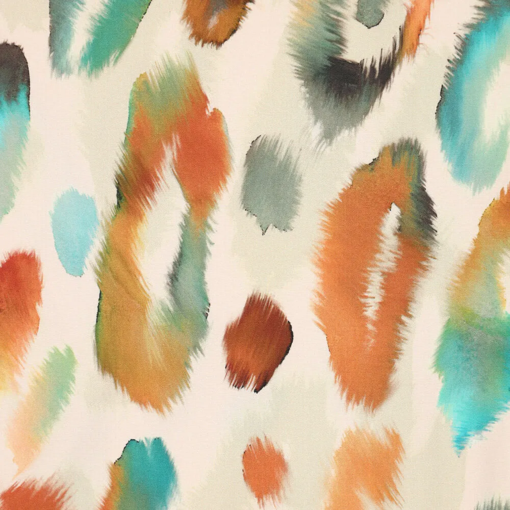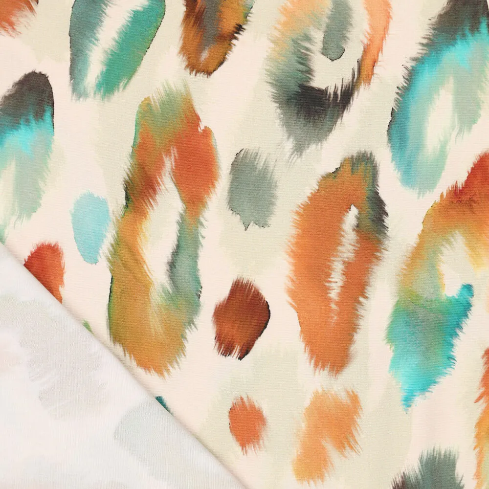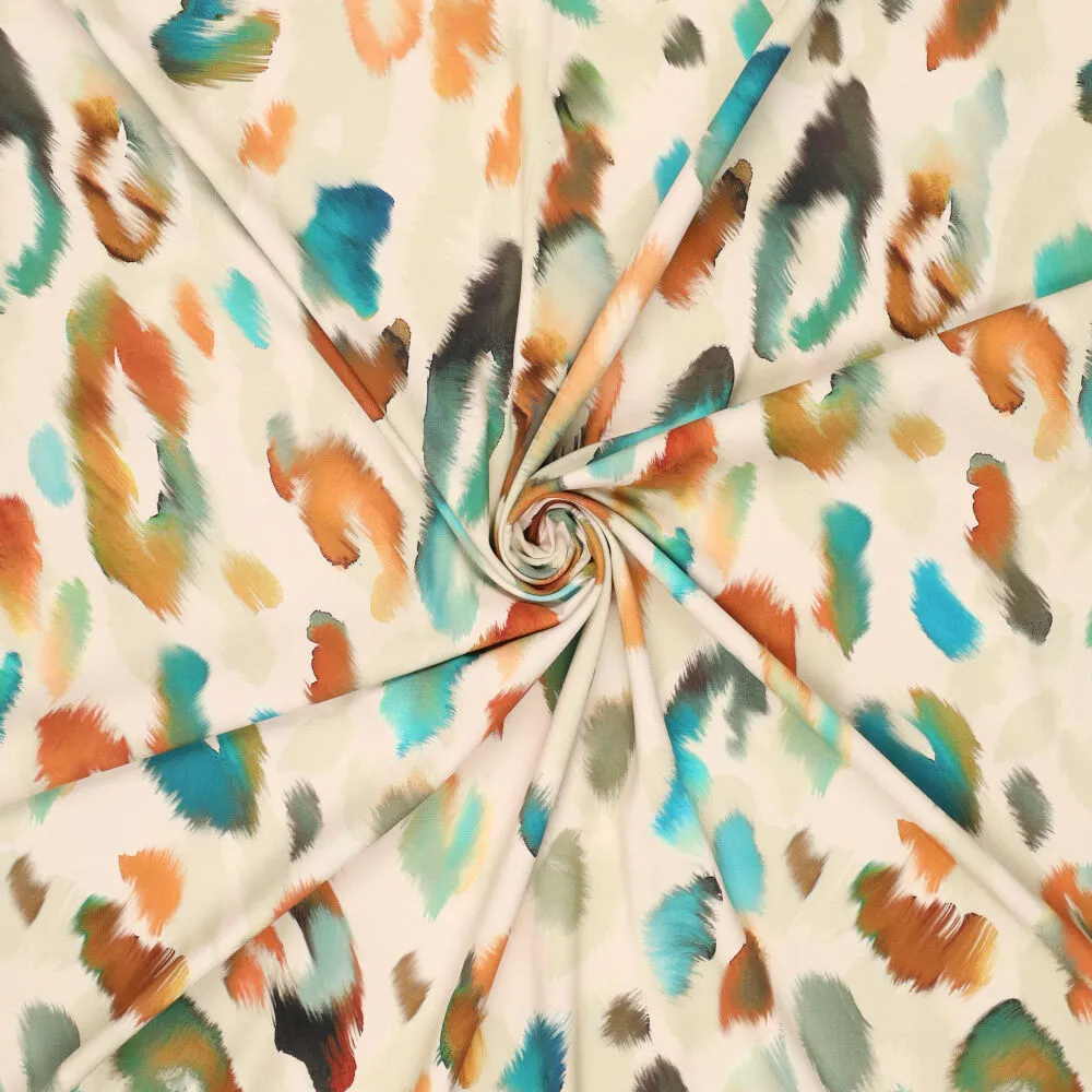 Deze luxe viscose met kleurrijke pantervlekken is een echte blikvanger. De speelse panterprint in verschillende kleuren geeft de stof een moderne en energieke uitstraling, terwijl de zachte viscose zorgt voor een elegante en vloeiende valling.