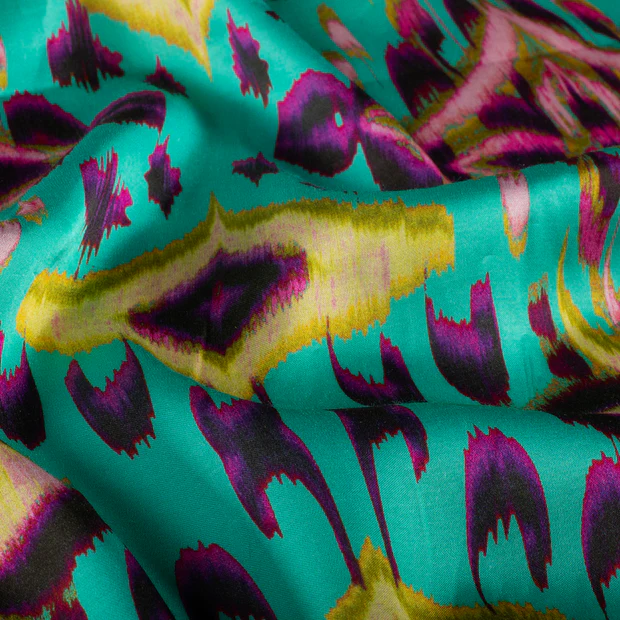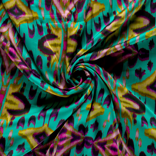Maak een gedurfde indruk met onze viscose satijn Electric Ikat. Deze opvallende stof combineert een rijke turquoise basis met een expressieve, symmetrische print in fuchsia, zwart en warme okertinten. Het grafische ikat-achtige patroon geeft de stof een exotische en moderne uitstraling met een echte high-fashion vibe.