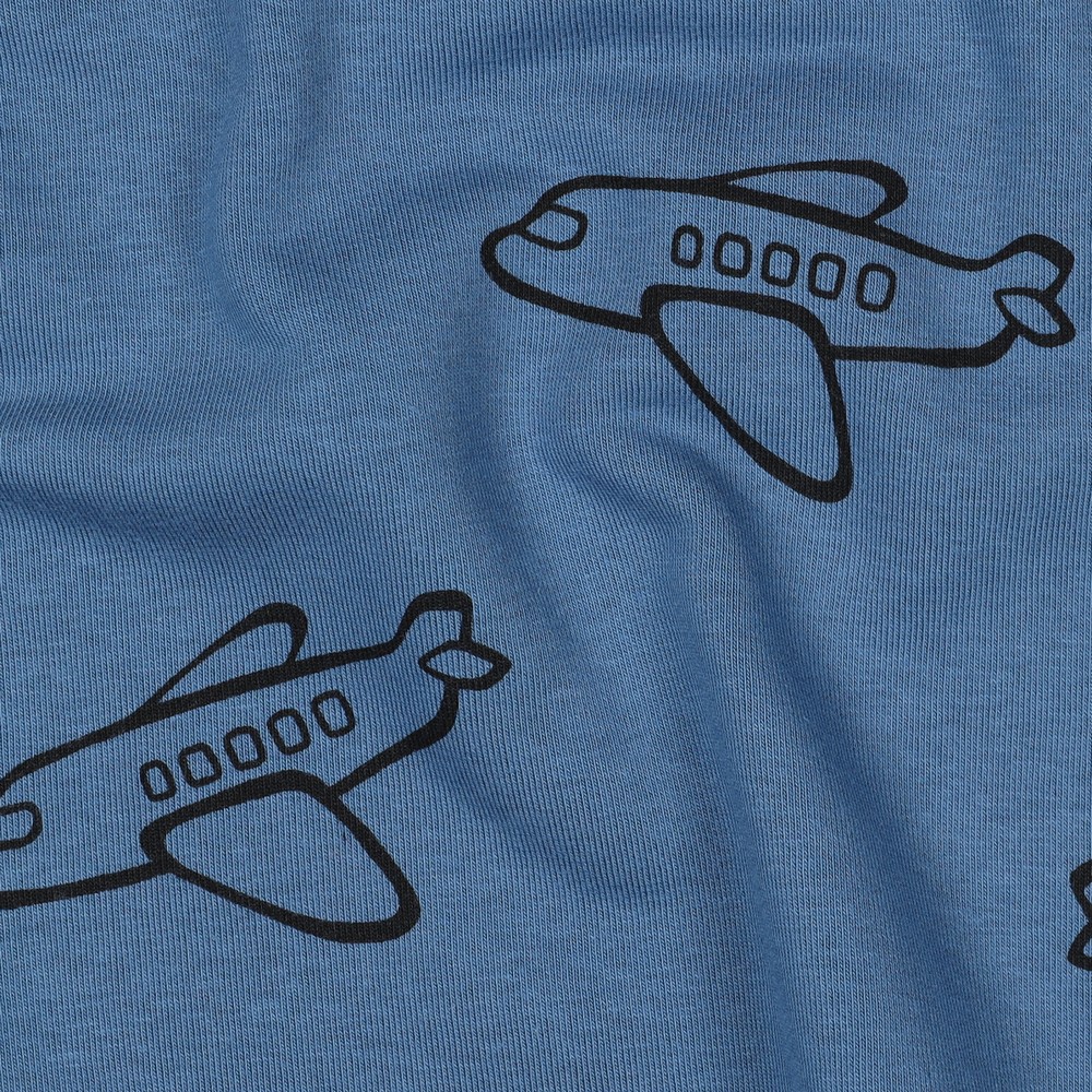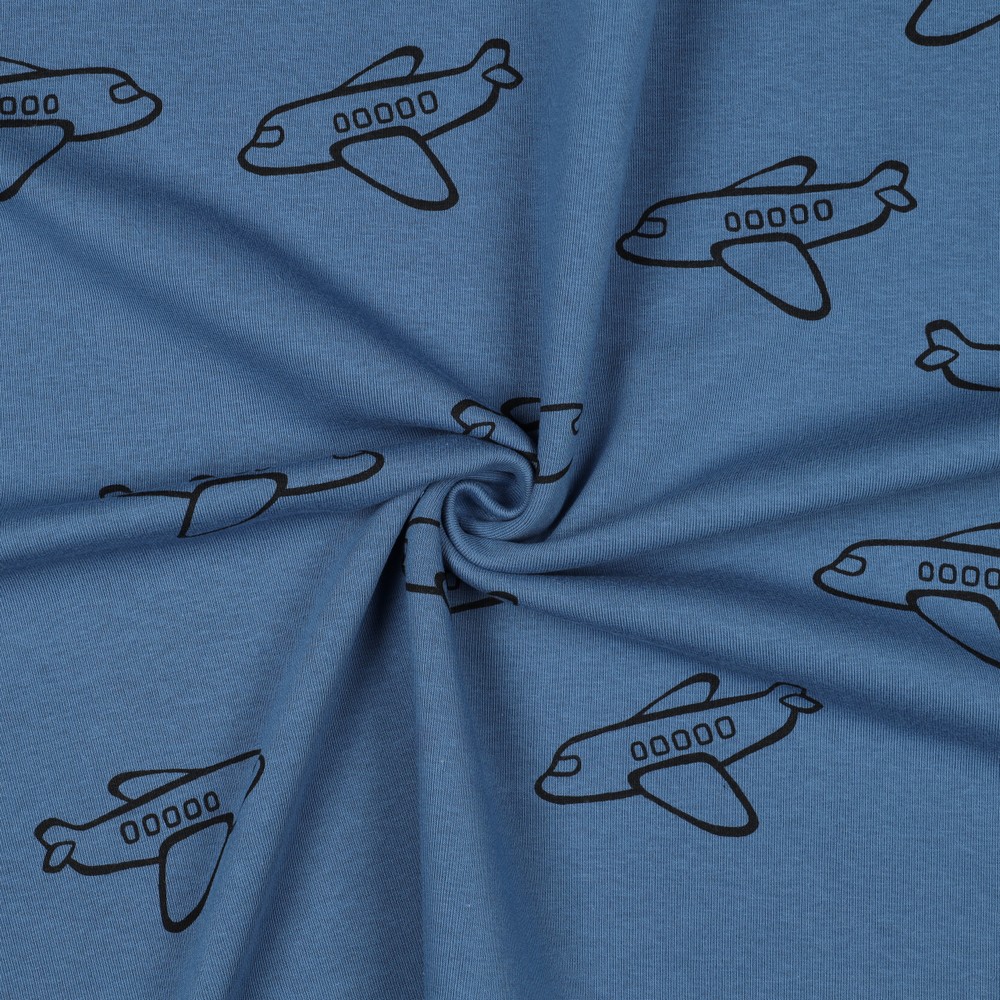 Laat kinderen (en volwassenen!) comfortabel de wereld verkennen met onze donkerblauwe joggingstof voorzien van een speels vliegtuigenmotief. Deze zachte, rekbare stof is perfect voor sweatpants, hoodies, vestjes of andere casual kleding die comfortabel zit en er leuk uitziet. Het vrolijke vliegtuigenprintje geeft iedere outfit een avontuurlijke touch.
