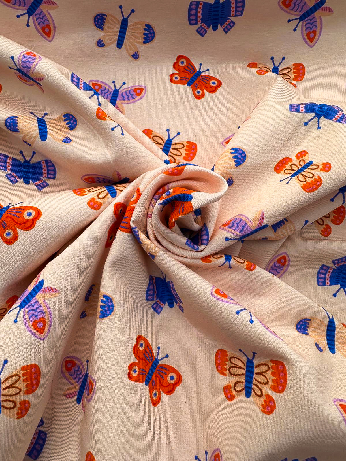 Vrolijke Vlinders is een speelse reactief bedrukte jersey stof met een kleurrijk vlinderpatroon dat direct een vrolijke uitstraling geeft. De heldere kleuren blijven langdurig mooi dankzij de reactieve druktechniek, zelfs na veelvuldig wassen.