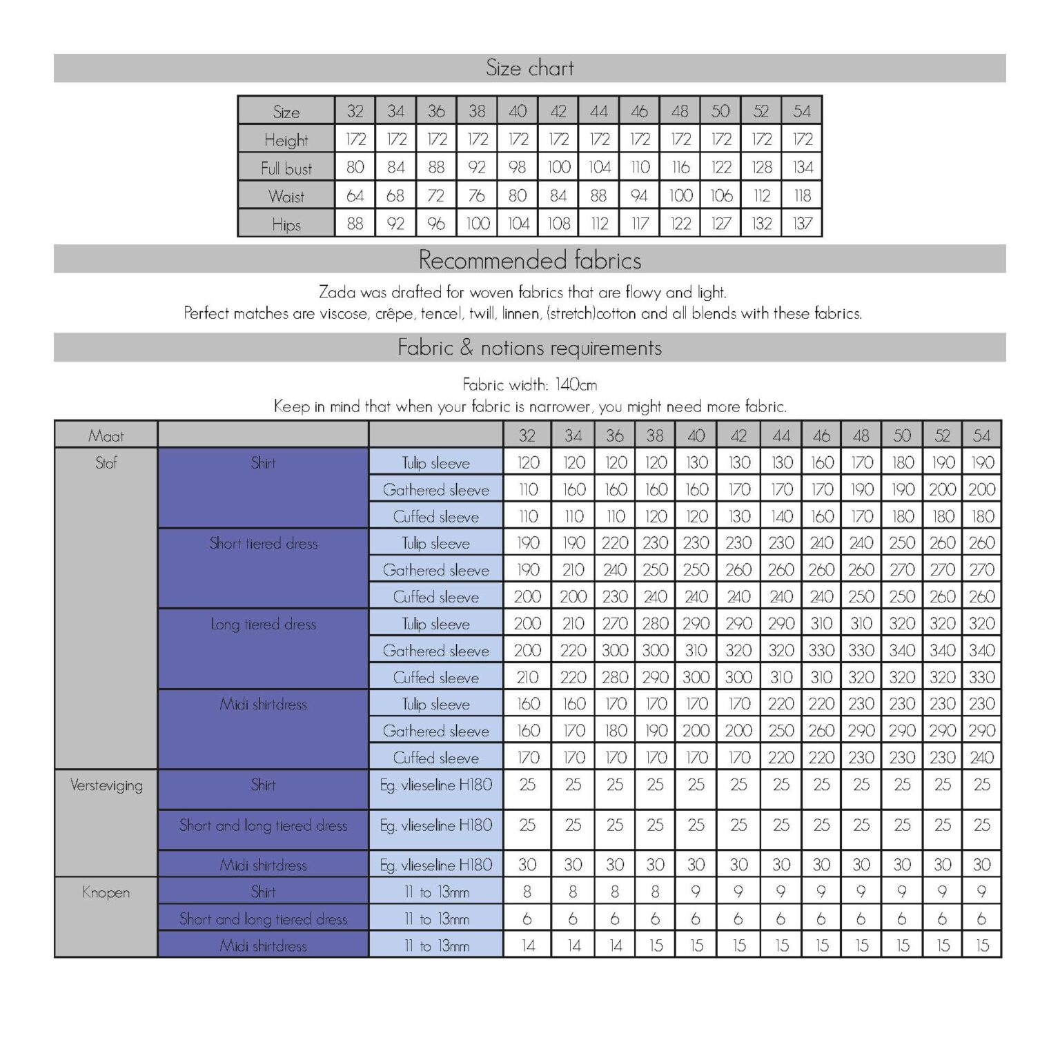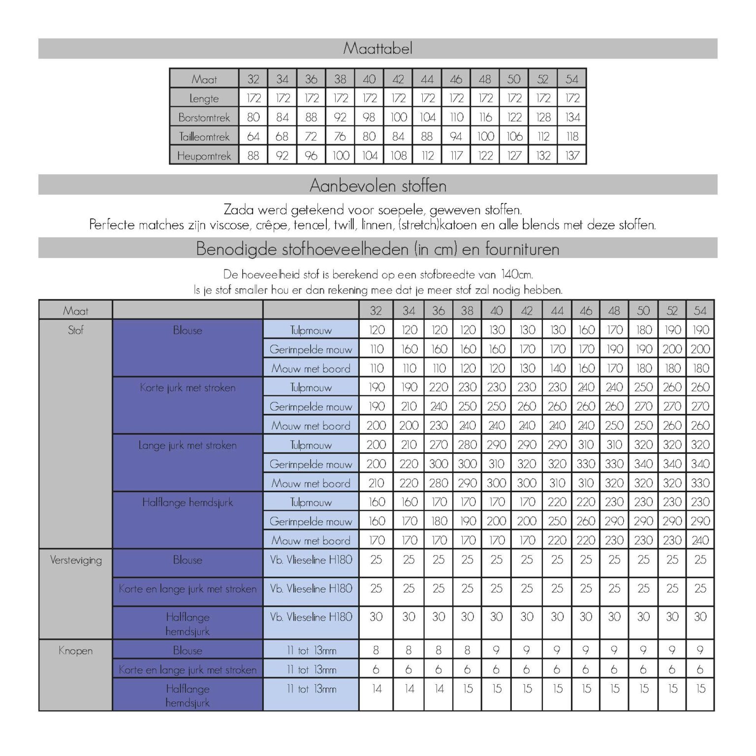 -het patroon afgedrukt op 2 A0 pagina’s in de maten 32, 34, 36, 38, 40, 42, 44, 46, 48, 50, 52 en 54